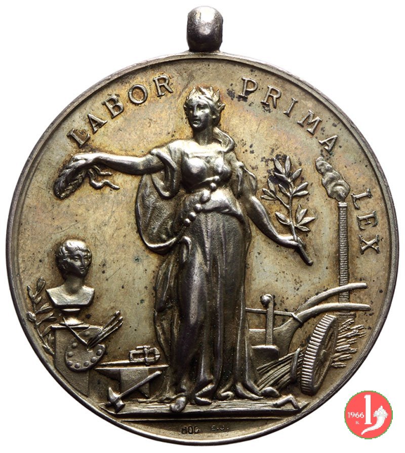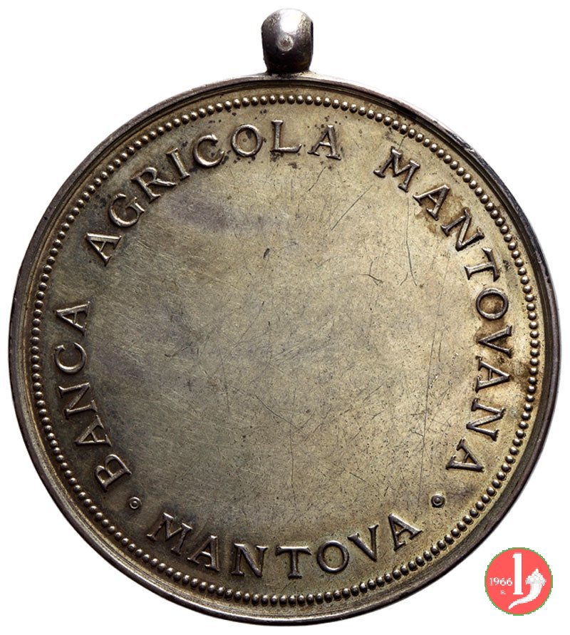 Banca Agricola Mantovana Dritto: LABOR _ PRIMA _ LEX la figura allegorica femminile drappeggiata e laureata, in piedi e volta di 3/4 a sx, regge serto e ramo d'alloro su prodotti ed emblemi dell'agricoltura, dell'arte e dell'industria (busto scultoreo con tavolozza e pennelli, morsa su incudine con martello, squadro, aratro con fascina di spighe, ruota dentata e ciminiera fumante) in esergo: S.J. campo vuoto per dedica | |