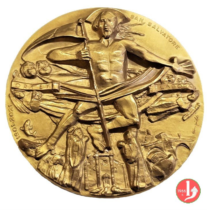 Chiesa SS Salvatore o di San Mauro 2021 Dritto: SAN SALVATORE _ 1901-2021 Cristo Salvatore in gloria regge stendardo ai lati due Angeli con quattro bimbi reggono nastro con: ORA ET _ LABORA in basso: Prospetto anteriore della Chiesa del SS. Salvatore a Pavia tra due Santi oranti; a dx il Ponte coperto in basso a dx: GRILLI in seconda riga: 120° RIAPERTURA AL CULTO SAN SALVATORE entro cerchio continuo: quattro putti reggono cartiglio con ARS = ET = AMOR | |