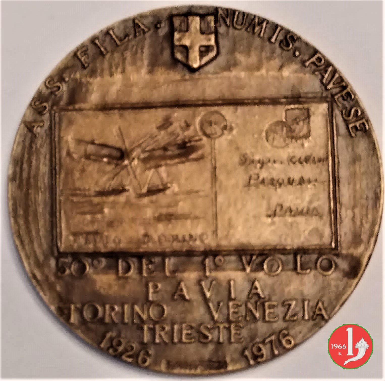 AFN - 50° Primo Volo Torino-Trieste 1976 Dritto: ASS. FILA. _ NUMIS. PAVESE Stemma di Pavia su cartolina del Volo Torino-Pavia in esergo: 50° DEL 1° VOLO = PAVIA = TORINO VENEZIA = TRIESTE in basso, circolarmente: 1926 _ 1976 in basso: PASQUALI | |