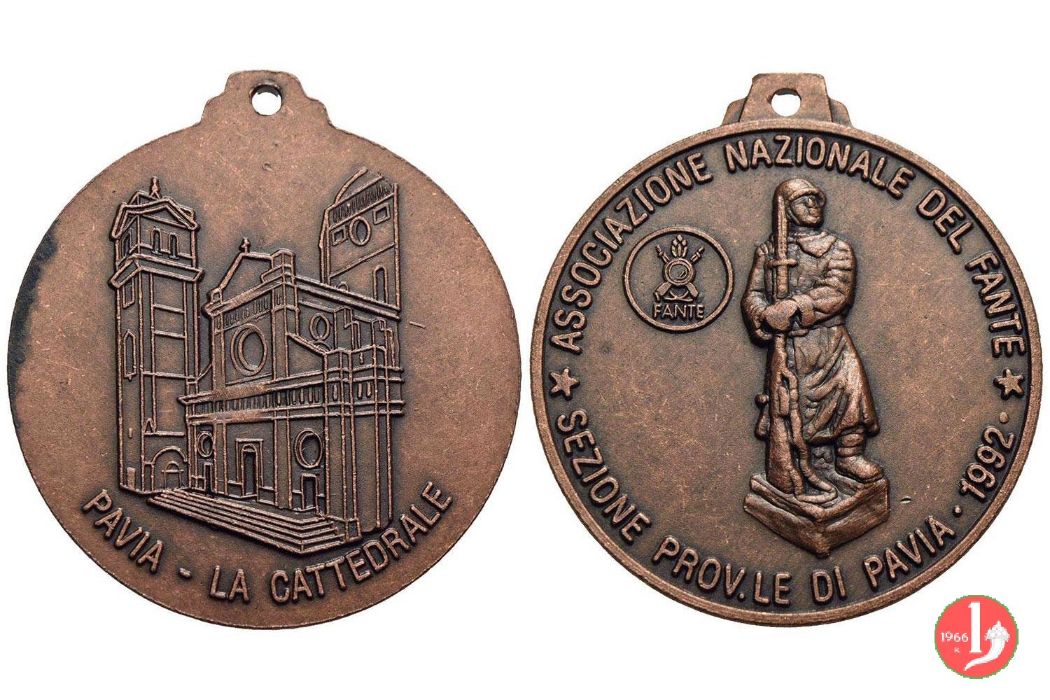 Associazione Nazionale del Fante 1992 Dritto: ASSOCIAZIONE NAZIONALE DEL FANTE = * SEZIONE PROV.LE DI PAVIA • 1992 * Statua di Fante e logo dell'Arma di fanteria entro cornice circolare in basso circolarmente: PAVIA - LA CATEDRALE | |