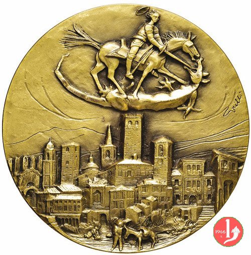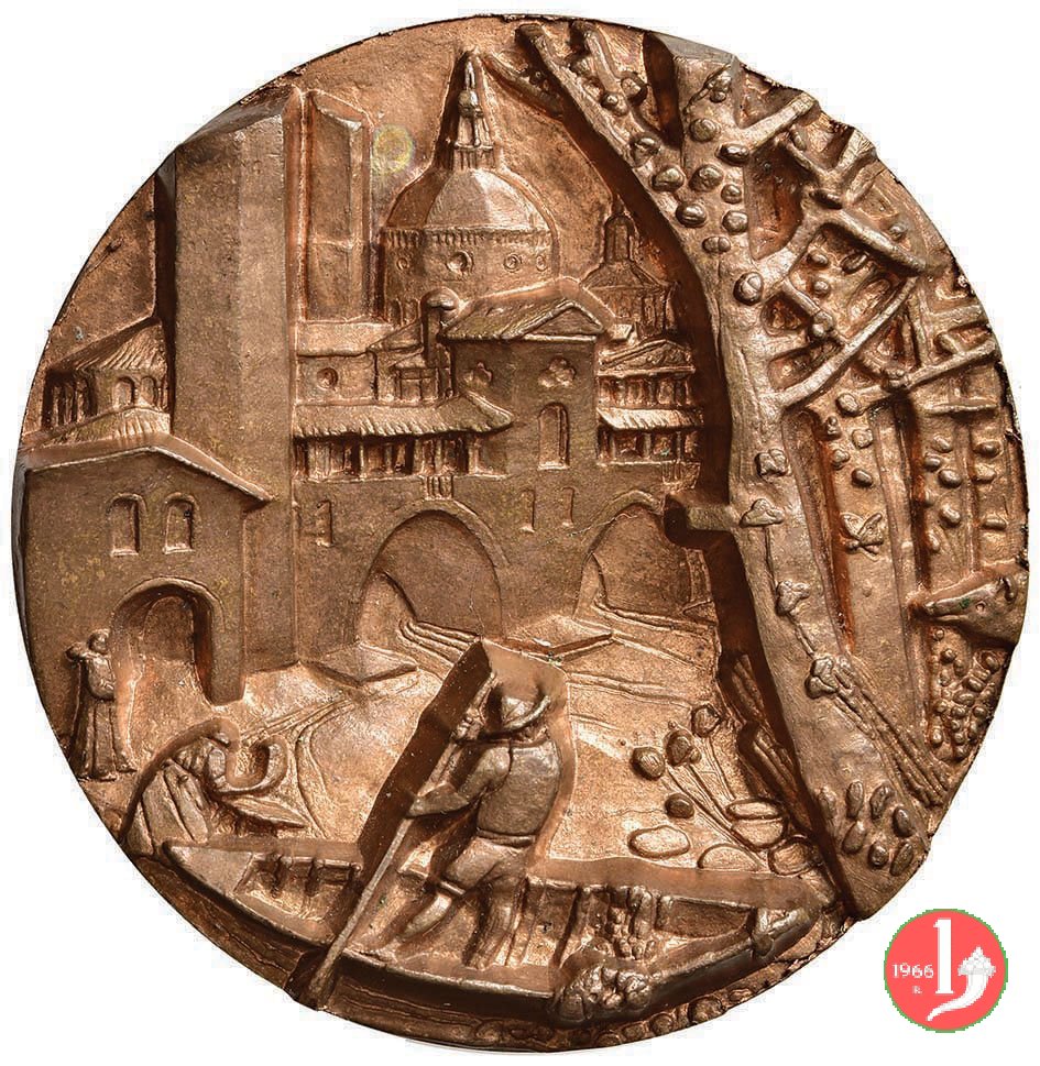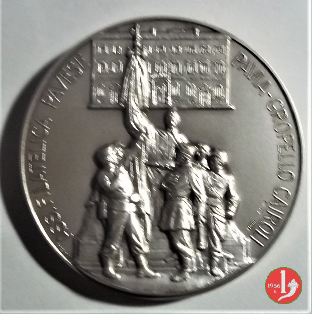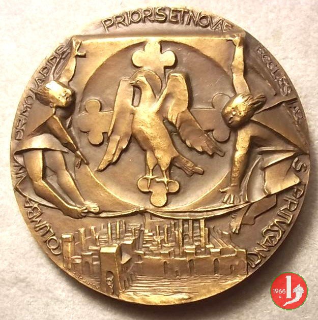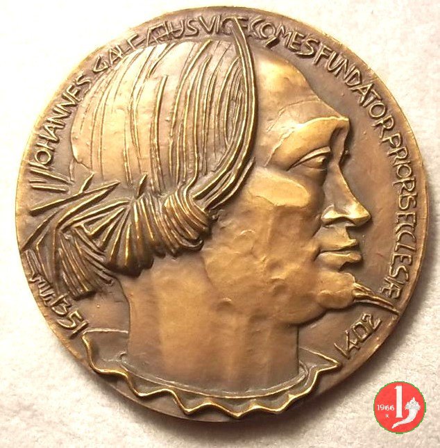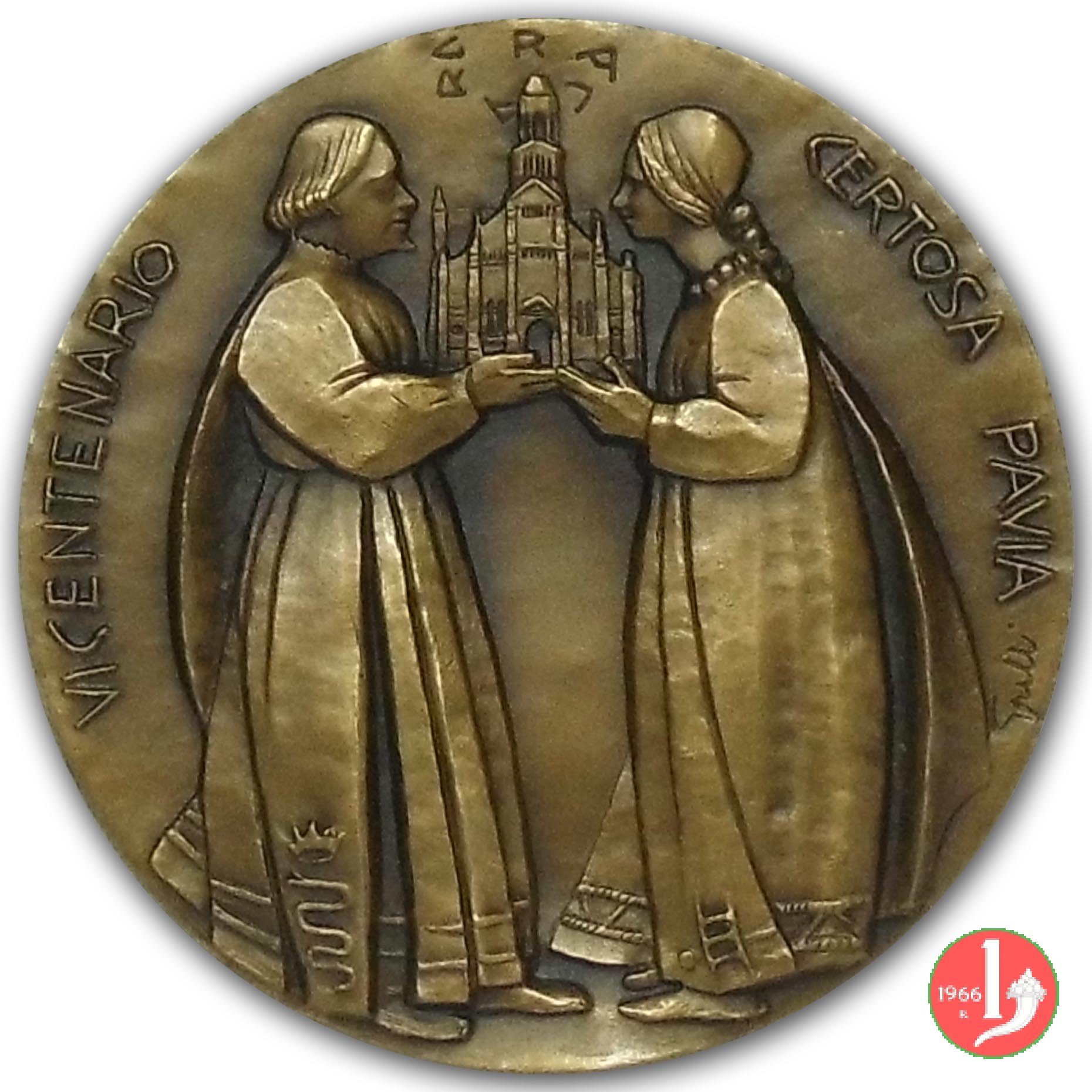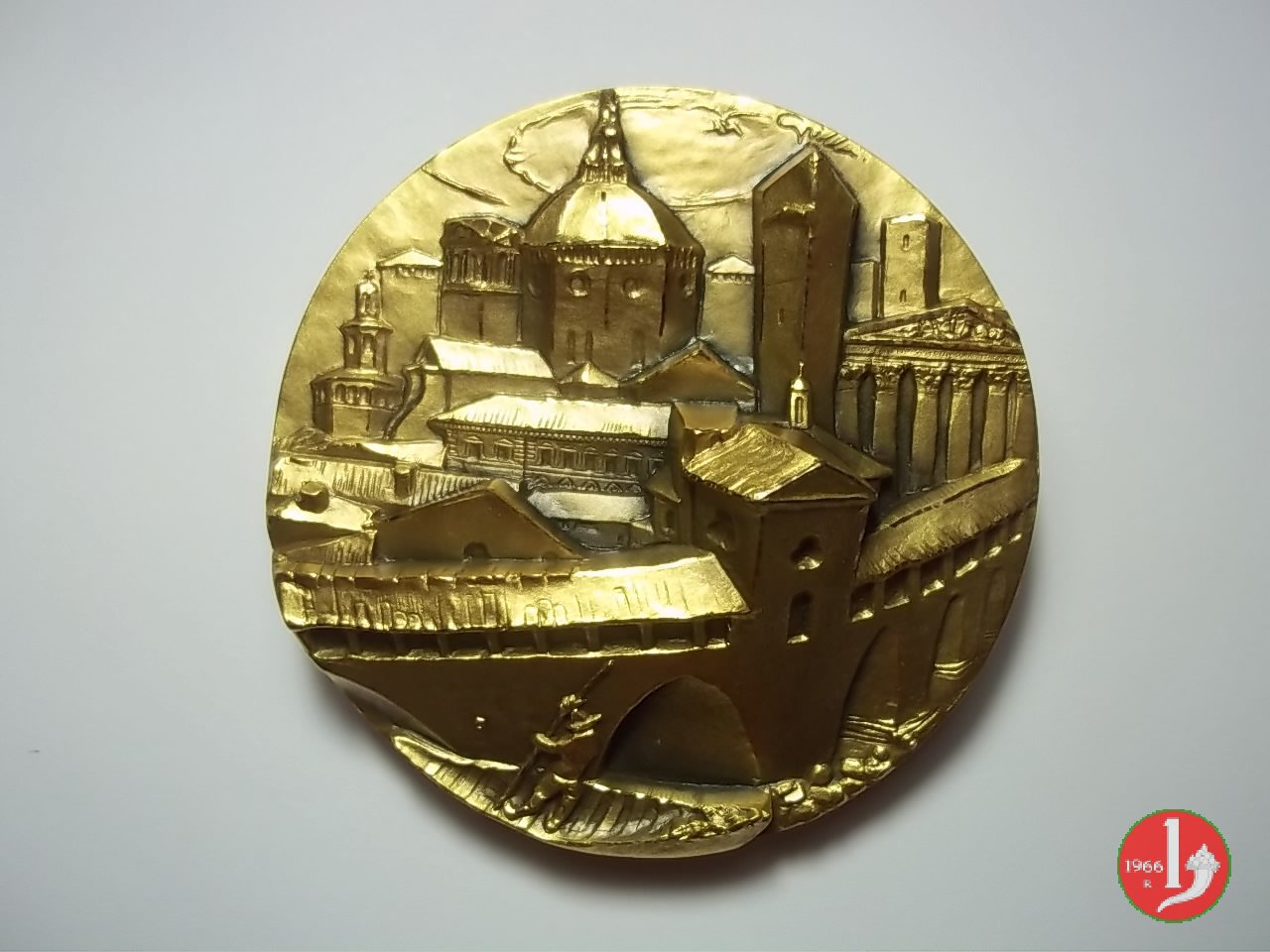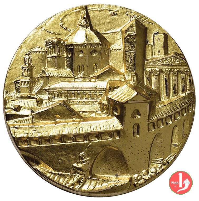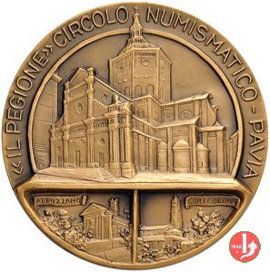 Nuova Chiesa dello Spirito Santo 1980 Dritto: IOHANNES GALEATIUS VICECOMES FUNDATOR PRIORIS ECCLESIAE = 1351 _ 1402, testa di Giovanni Galeazzo Visconti a dx in basso, a sx: GRILLI entro targa sorretta da due bimbi ai lati ed entro medaglia: Colomba nimbata su Croce rinforzata sormonta la vista della Città di Pavia in basso, a sx: S. JOHNSON | |