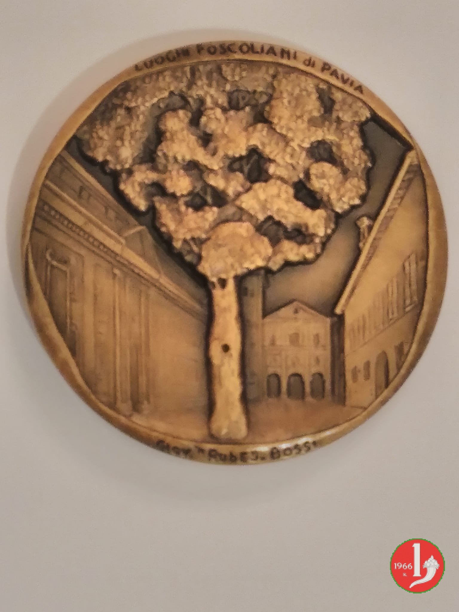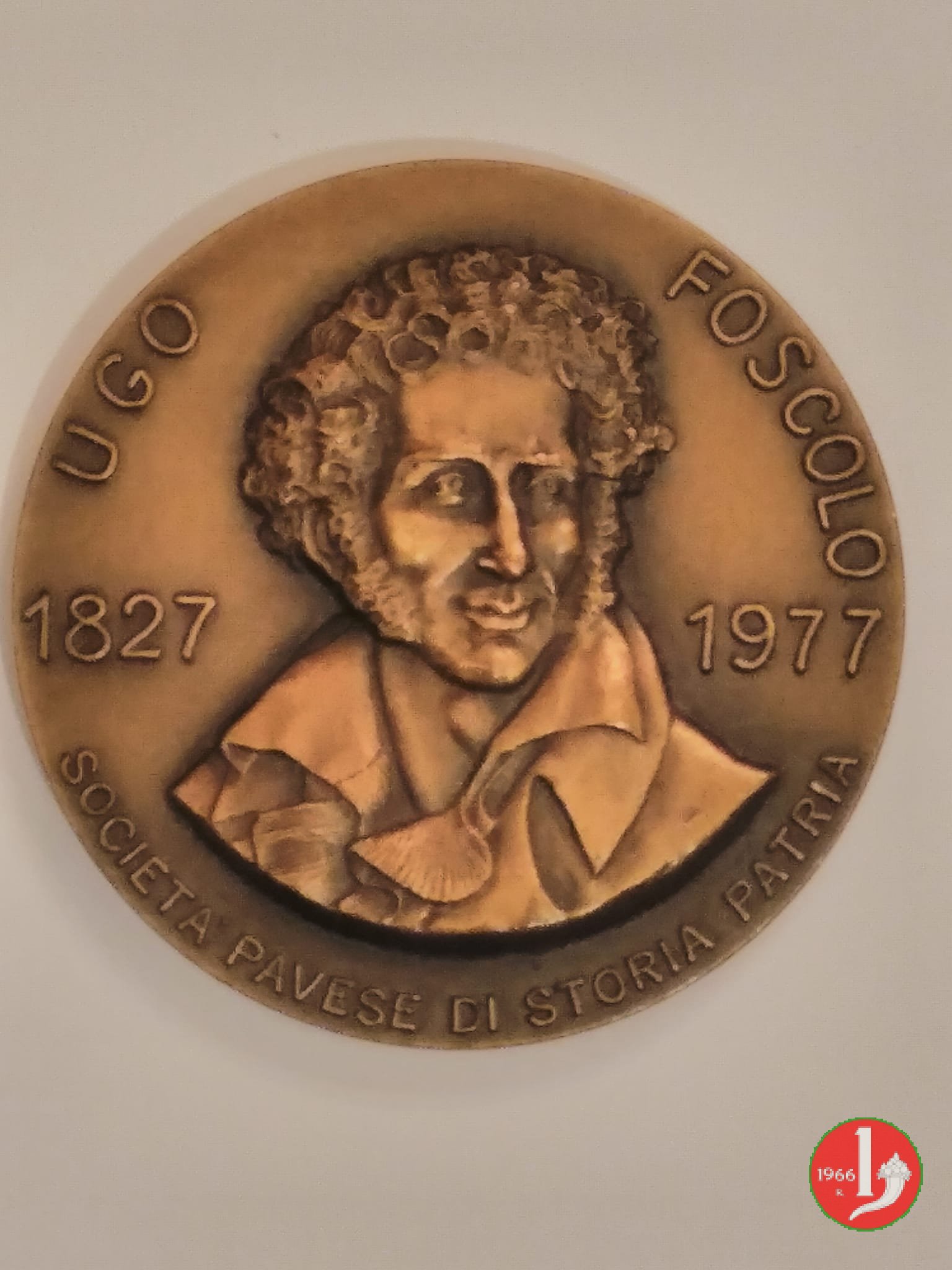 150° Ugo Foscolo 1977 Dritto: UGO _ FOSCOLO busto di 3/4 a dx con giubba e camicia ai lati: 1827 _ 1977 in basso, circolarmente: SOCIETA' PAVESE DI STORIA PATRIA vista della Casa Natale di Ugo Foscolo a Pavia in basso: GIOV. "RUBES" BOSSI | |