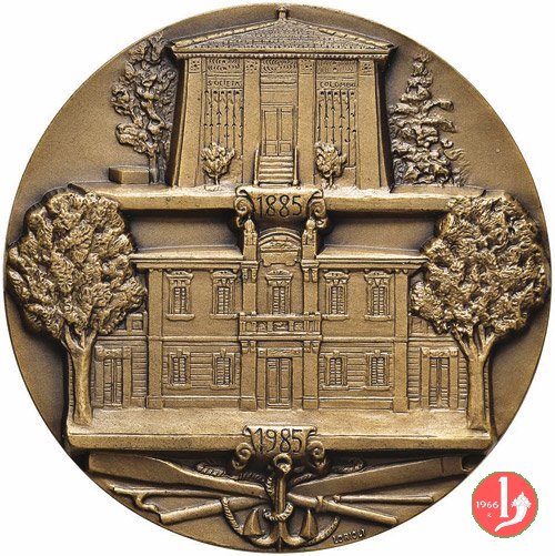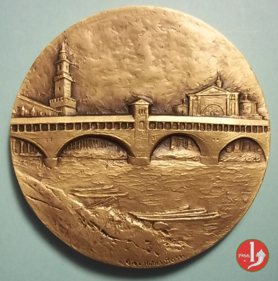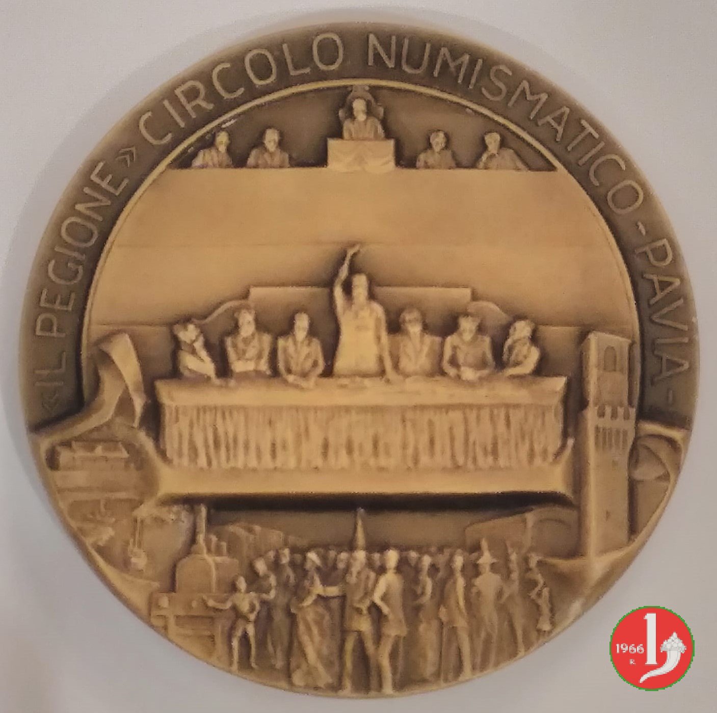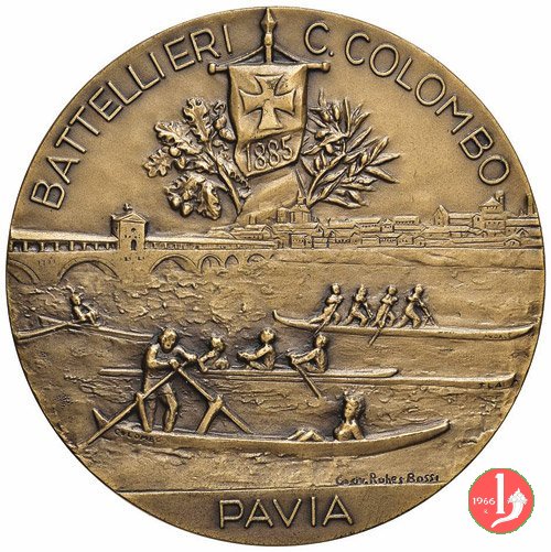100° Battellieri Colombo 1985 Dritto: BATTELLIERI _ C. COLOMBO Stendardo dei Battellieri 1885 sulla vista panoramica della Città di Pavia con il Ponte coperto e barche sulla barca in primo piano: COLOMBO sopra la linea dell'esergo, a dx: RUBES BOSSI in esergo: PAVIA sulla linea dell'esergo, entro cartiglio: 1985 in esergo: remi ed arpione decussati in basso, a dx: LORIOLI | |