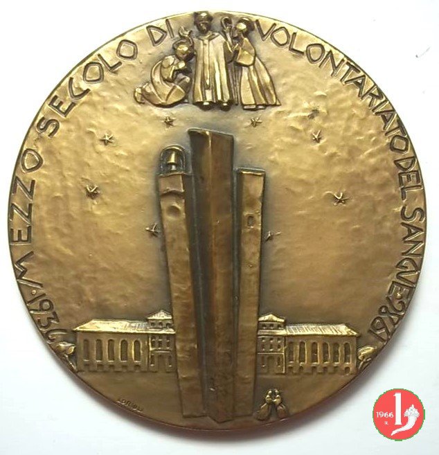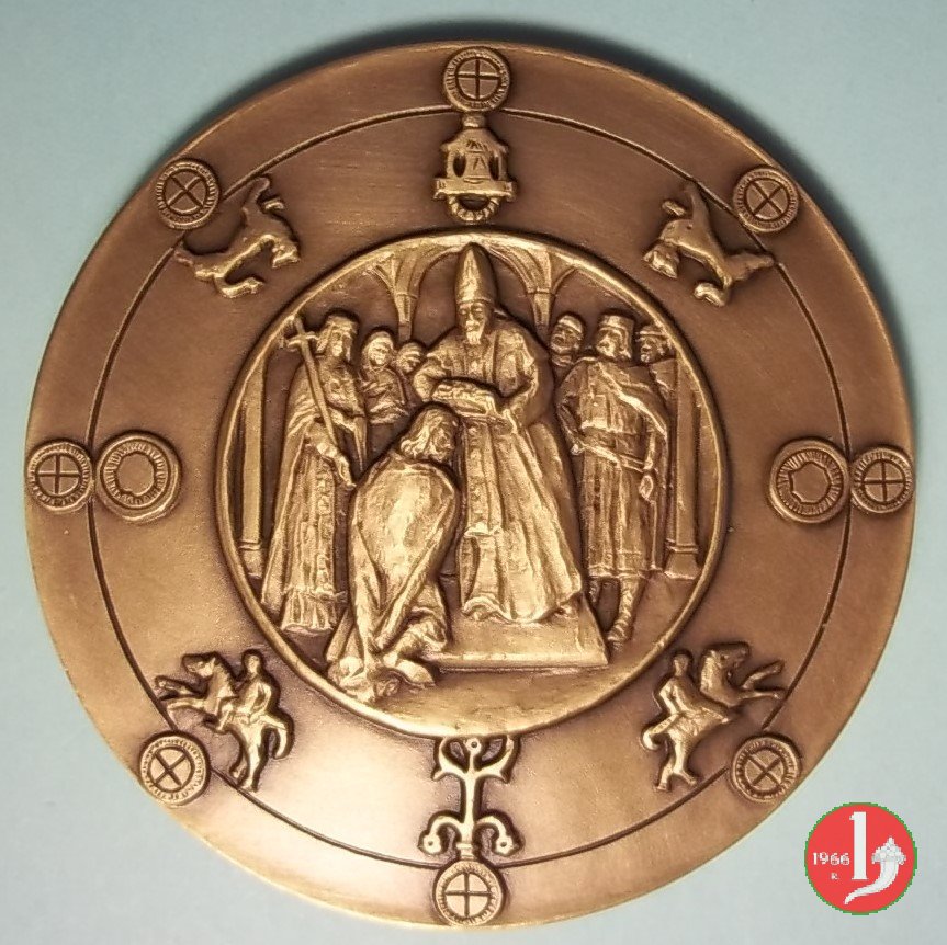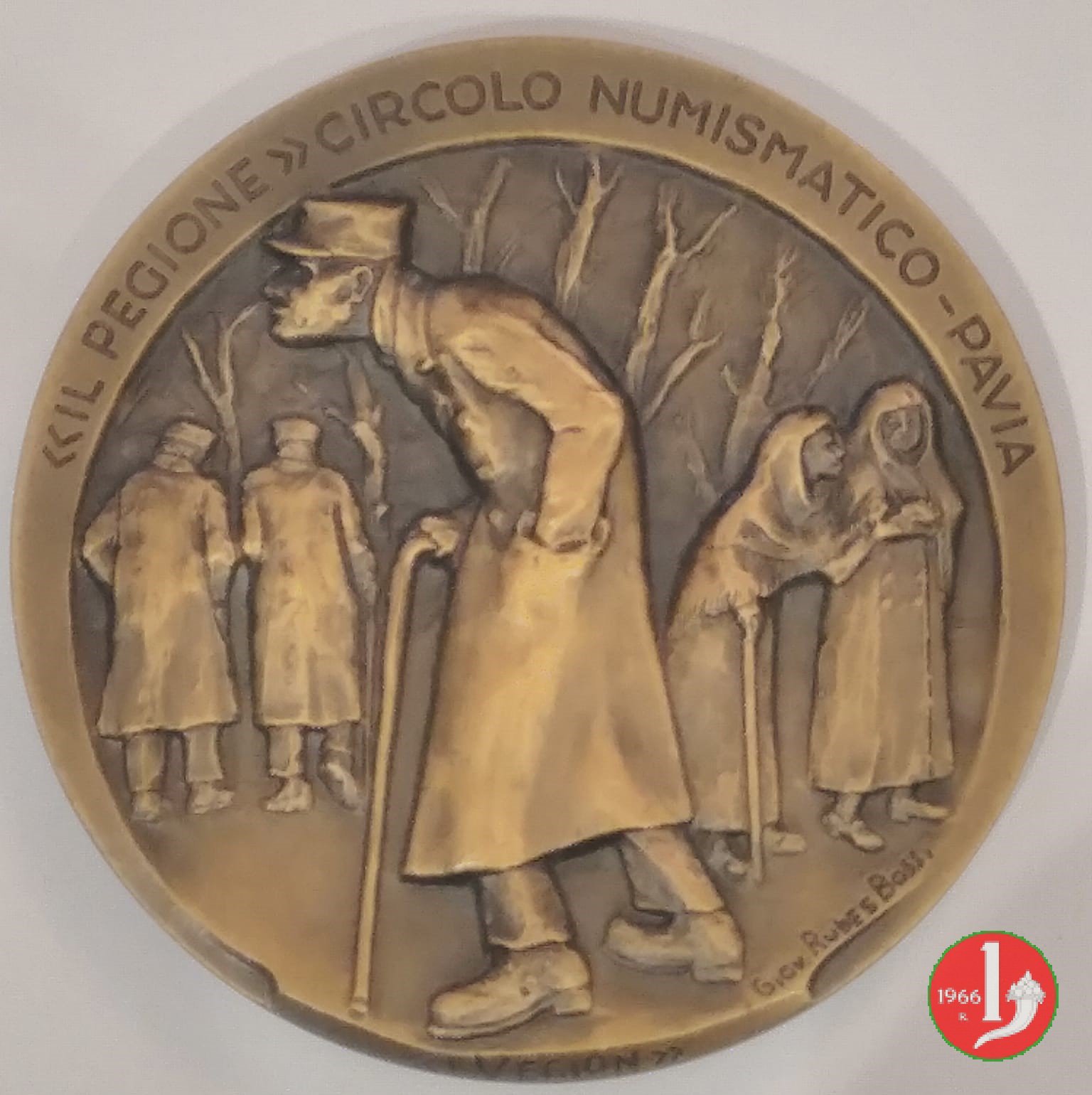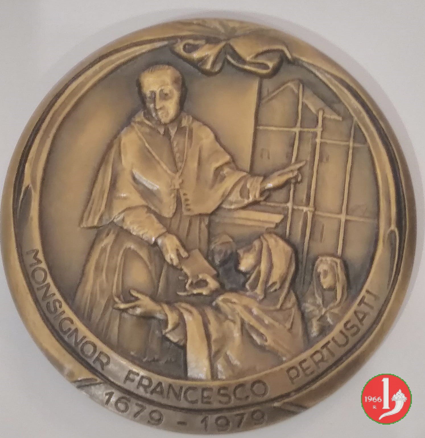300° Francesco Pertusati 1979 Dritto: MONSIGNOR FRANCESCO PERTUSATI 1679 - 1979 Mezzo busto di fronte del vescovo Perusati con abito talare e Croce pettorale tra fedeli genuflessi Vecchio con bastone cammina verso sx tra quattro vecchi sullo sfondo in basso a dx: GIOV RUBES BOSSI | |