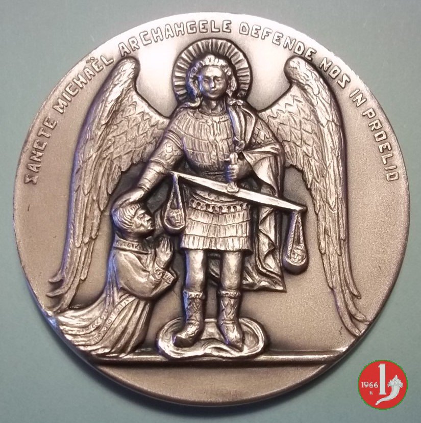 100° Consacrazione Basilica di San Michele 1980 Dritto: BASILICAE S. MICHAELIS M.RIS PAPIAE vista della Basilica di San Michele Maggiore in Pavia sopra la linea dell'esergo: GIOV. RUBES BOSSI in esergo: CDF _ • 1880 • CONSECRATIO • 1980 • _ ITALY San Michele nimbato, ad ali spiegate, in piedi, di fronte, pone testa sul capo di una figura genuflessa verso dx e regge bilancia | |