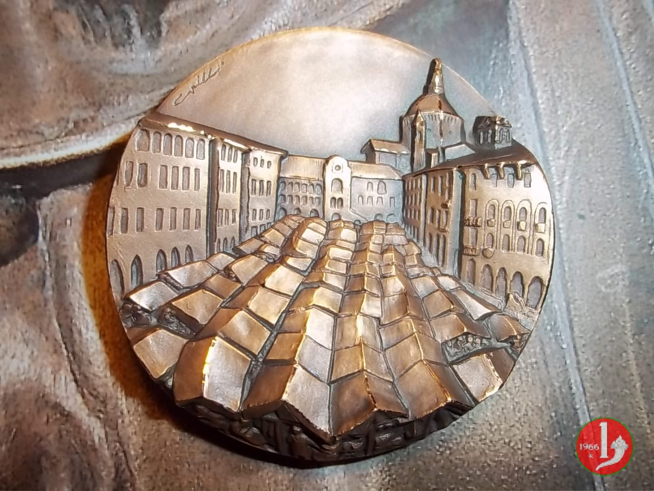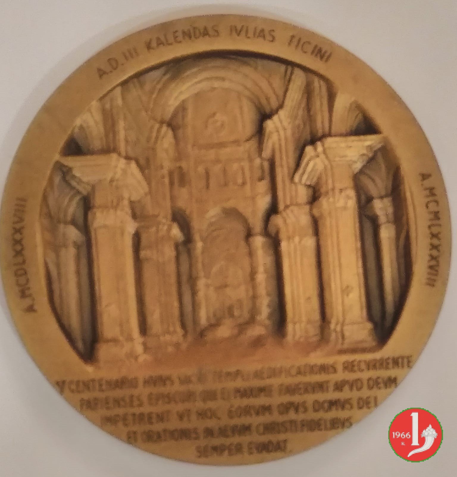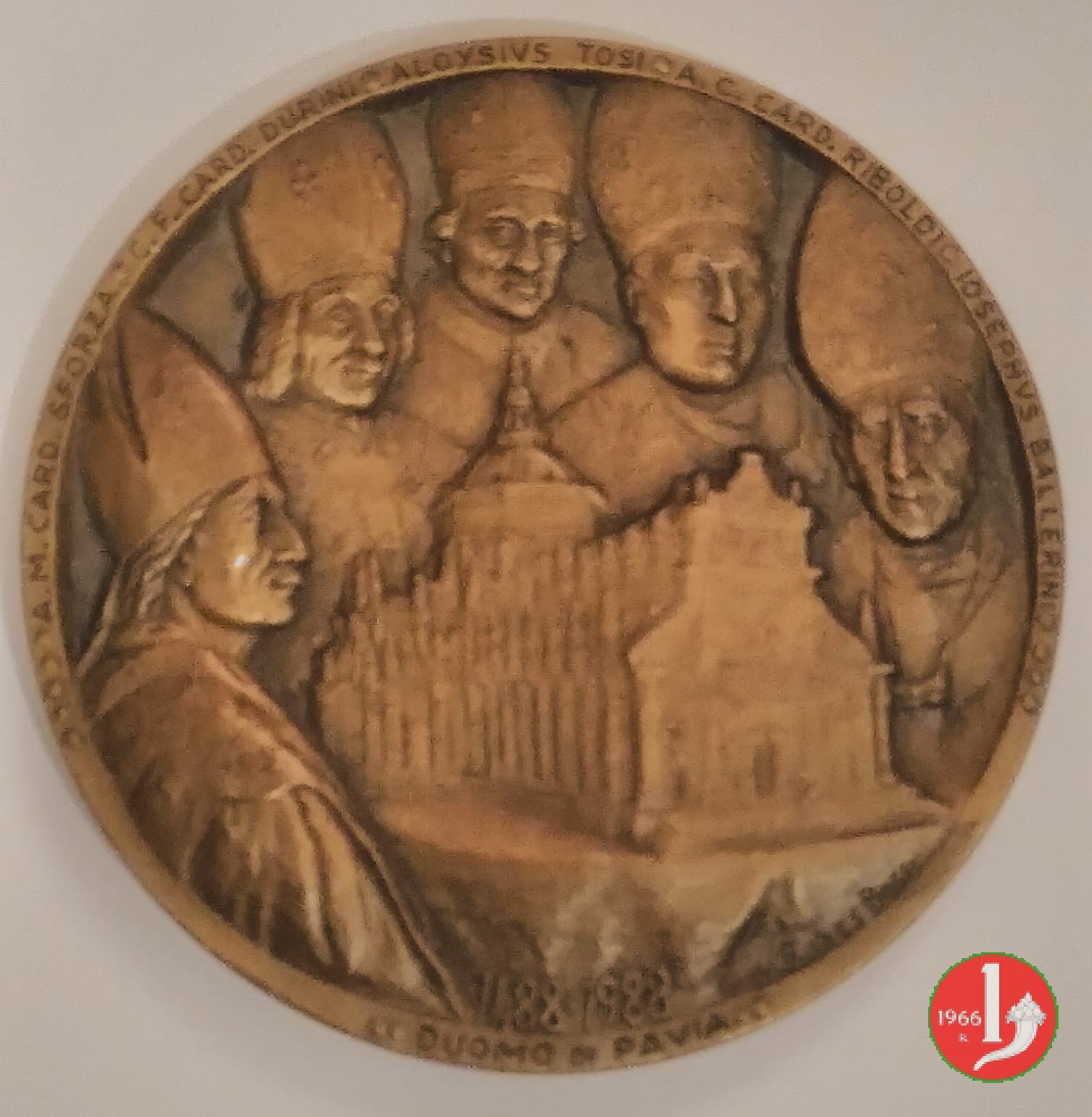 500° Duomo di Pavia 1988 Dritto: A. M. CARD. SFORZA • C. F. CARD. DURINI • ALOYSIUS TOSI • A. C. CARD. RIBOLDI • IOSEPHVS BALLERINI …. •. DUOMO DI PAVIA •. Vista del Duomo di Pavia con attorno busti dei cinque cardinali con mitre In basso: 1488-1988 a dx: GIOV. RUBES BOSSI vista interna della navata centrale del Duomo di Pavia in basso a dx: LORIOLI in esergo: V CENTENARIO HVIVS SACRI TEMPLI AEDIFICATIONIS RECVRRENTE = PAPIENSES EPISCOPI QUI EI MAXIME FAVERVNT APVD DEVM = IMPETRENT VT HOC EORVM OPVS DOMVS DEI = ET ORATIONIS IN AEVVM CHRISTI FIDELIBVS = SEMPER EVADAT. | |