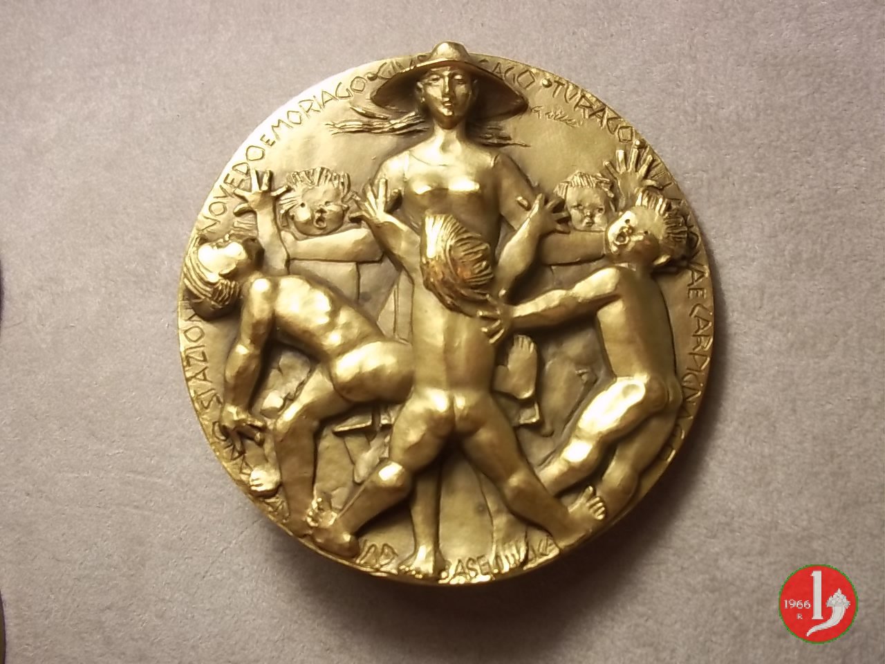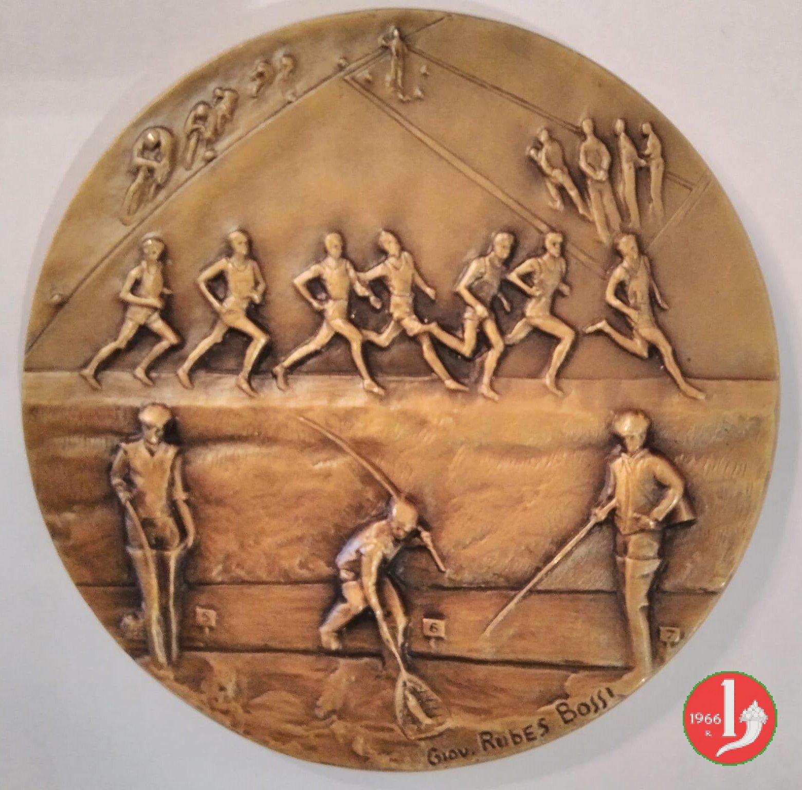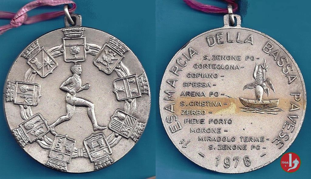 Esamarcia della Bassa Pavese 1976 Dritto: Atleta in corsa, verso dx, entro cerchio di nove stemmi coronati su ghirlanda d'alloro Verso: 1° ESAMARCIA DELLA BASSA PAVESE = - 1976 - nel campo, a dx: pannocchia di mais su barca nel campo, a sx: S. ZENONE PO - = CORTEOLONA - = COPIANO - = SPESSA - = ARENA PO - = S. CRISTINA - = ZERBO - = PIEVE PORTO = MORONE - = MIRADOLO TERNE - = S. ZENONE PO - | |