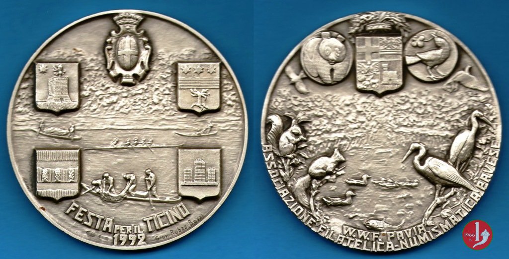 AFN - Festa per il Ticino 1992 Dritto: in alto: Stemma coronato di Pavia imbarcazioni nel Ticino con ai lati quattro stemmi in basso: FESTA PER IL TICINO = 1992 in basso, a dx: GIOV. RUBES BOSSI con vista della fauna presente nel Fiume in basso: W.W.F. PAVIA = ASSOCIAZIONE FILATELICO NUMISMATICA PAVESE | |