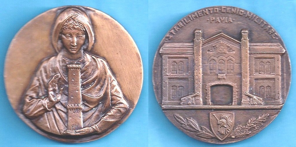 Santa Barbara Genio Militare di Pavia Dritto: Busto di Santa Barbara, velata e benedicente di fronte, regge torre in palmo di mano a dx, presso il bordo: RUBES BOSSI in alto: • PAVIA • Prospetto anteriore dello Stabilimento con due cannoni in esergo: Stemma del Servizio Tecnico del Genio tra rami d'alloro e quercia | |