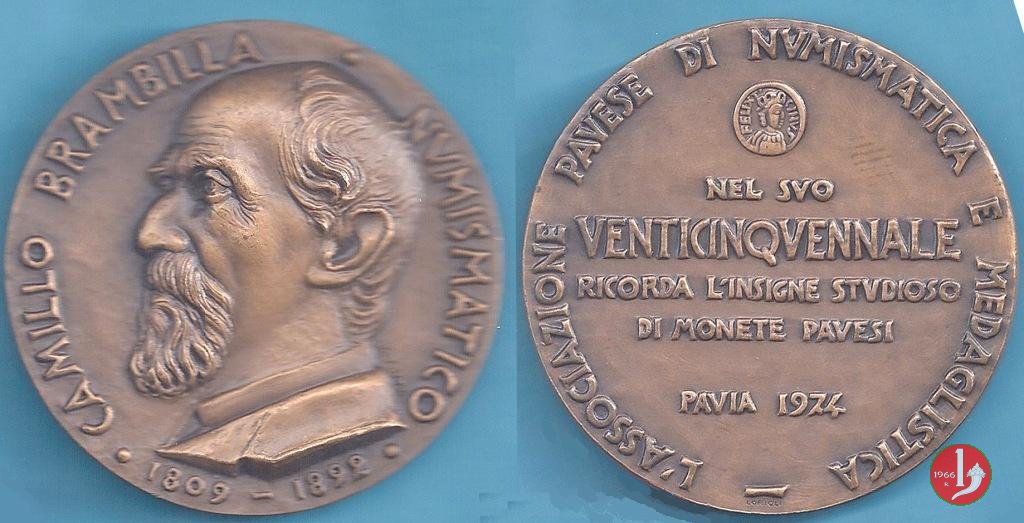 Camillo Brambilla 1974 Dritto: CAMILLO BRAMBILLA • NVMISMATICO = • 1809 – 1892. Busto a sinistra in basso a dx.: E • TESTA Nel campo, in alto, logo entro medaglia con: FELIX TI – CINVS busto (Totila) di 3/4 a dx sotto: NEL SVO = VENTICINQVENNALE = RICORDA L’INSIGNE STVDIOSO = DI MONETE PAVESI = PAVIA 1974 | |