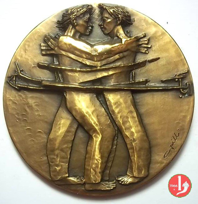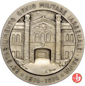 Stabilimento Genio Militare Pavia 1981 Dritto: STABILIMENTO GENIO MILITARE • PAVIA • su rami d'alloro e quercia legati in basso da nastro: Due uomini nudi uno batte ferro su incudine e l'altro regge bandiera in basso: GIOV. BOSSI sotto a sx: LORIOLI sotto al centro: 1981 | |