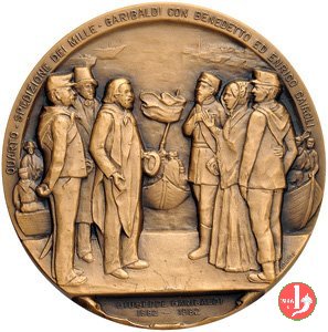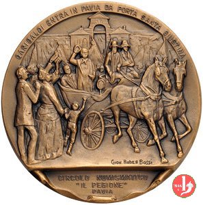 CN 100° Morte di Garibaldi 1982 Dritto: QUARTO • SPEDIZIONE DEI MILLE • GARIBALDI CON BERRETTO ED ENRICO CAIROLI L'incontro tra Garibaldi e Cairoli in esergo: 1882-1982 Garibaldi entra in carrozza tra la folla sopra alla linea dell'esergo: GIOV. RUBES BOSSI in esergo: CIRCOLO NUMISMATICO = "IL PEGIONE" = PAVIA | |