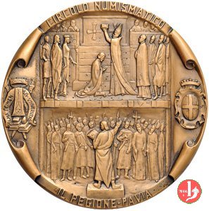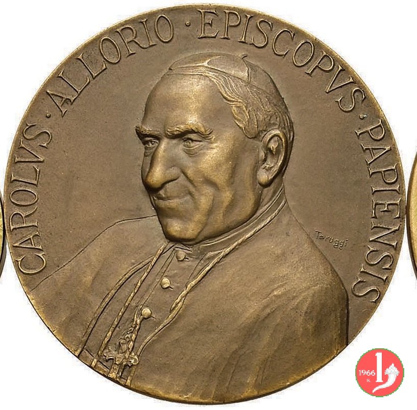 Vescovo Carlo Allorio Dritto: CAROLVS • ALLORIO • EPISCOPVS • PAPIENSIS busto di 3/4 a sx con berretto, abito talare e Croce pettorale sulla spalla dx: TERUGGI Stemma Vescovile sormontato da pallio, Croce e galero a sei nodi e sopra a nastro su cui: FOLIVM _ EIVS _ NON DEFLVET | |