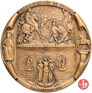 CN - Bimillenario di Pavia 1991 Dritto: BIMILLENARIO DI PAVIA tra Vescovo benedicente di fronte e statua equestre su colonna: Due scene della Storia di Pavia in basso: GIOV. RUBES BOSSI Tra lo stemma dell'Università di Pavia e quello del Comune, coronato ed entro cartiglio: due scene della storia di Pavia | |