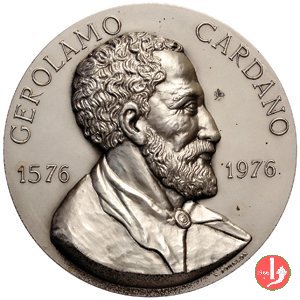 400° Girolamo Cardano 1976 Dritto: GEROLAMO CARDANO busto a dx con camicia ai lati: 1576 _ 1976 sotto, a dx: S. JOHNSON Giunto cardanico su cartiglio con formule matematiche, esperimenti chimici ed astrolabio sotto: GIOV. RUBES BOSSI | |