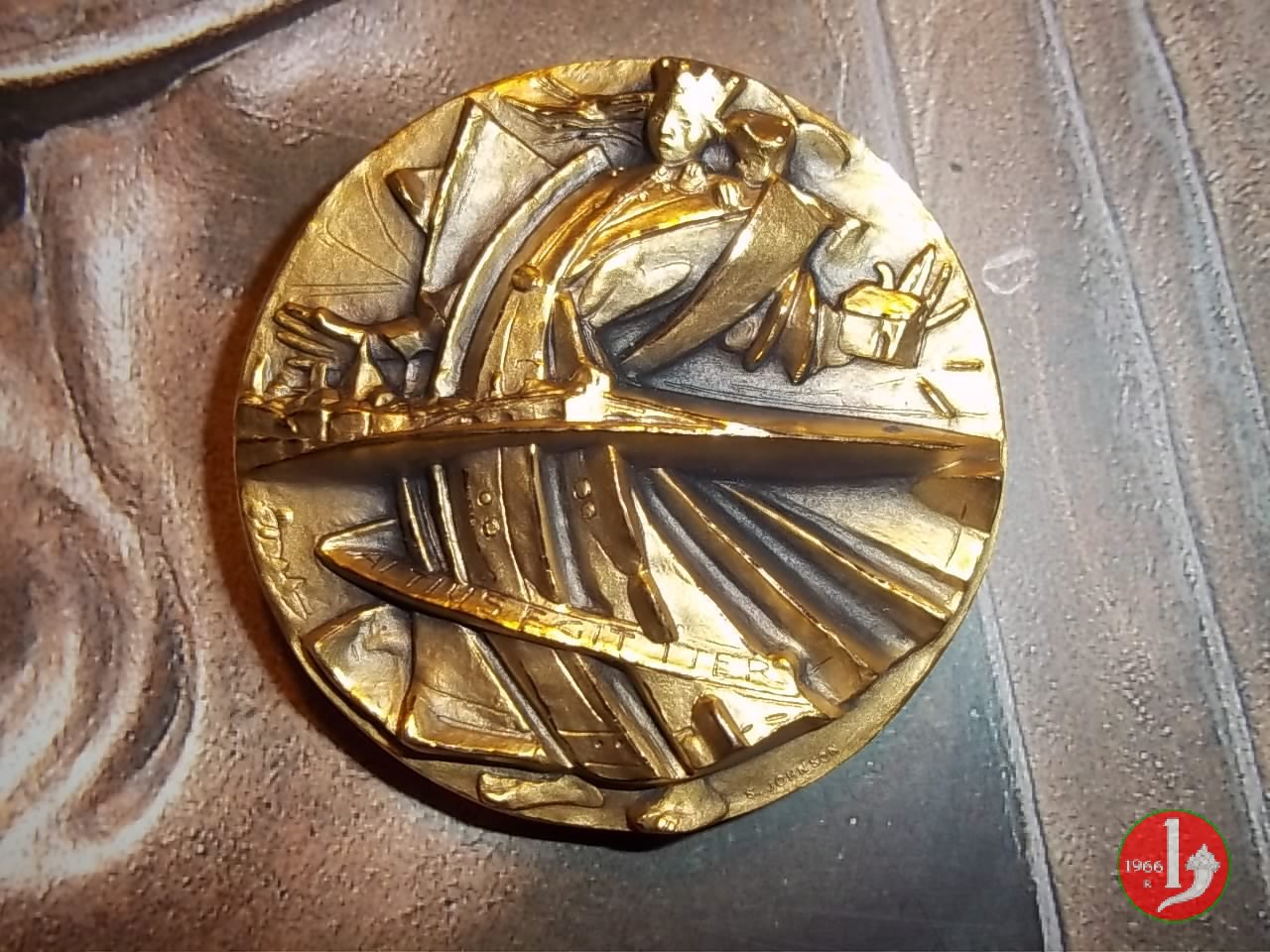20° Arma Aeronautica di Pavia 1981 Dritto: La Madonna di Loreto coronata in piedi di 3/4 a sx, attraversato da profilo di paesaggio e nastro nel nastro in basso: ALTIUS EGIT ITER a sx, corsivo, presso il bordo: GRILLI in basso, a dx: S. JOHNSON in basso, a dx: 19 _ 8 _ 1 = 19 _ 6 _ 1 vortice e composizione | |