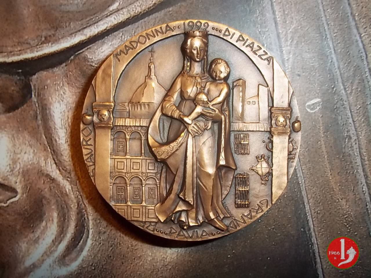 Restauro Madonna di Piazza Grande 1992 Dritto: RE _ STAURO _ MADONNA • • • 1992 • • • DI PIAZZA _ GRANDE = • • PAVIA • • • L'immagine della B. V. in piedi, di fronte, regge Bambino in braccio con globo crucifero, entro arcata e, sullo sfondo, il Palazzo del Broletto a dx del piede: S. JOHNSON in alto, a sx: GRILLI | |