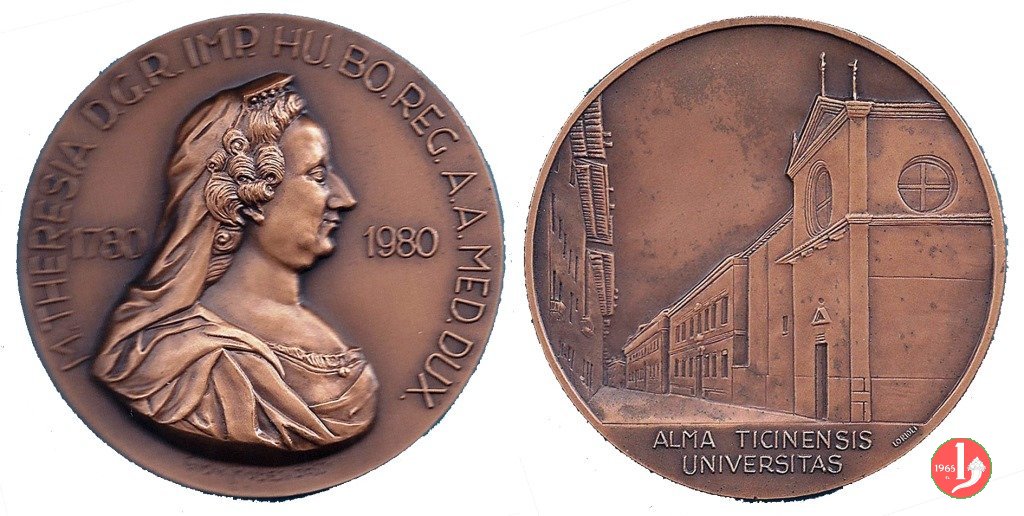 200° Maria Teresa d' Austria 1980 Dritto: M. THERESIA D.G.R. IMP. HU. BO. REG. A.A. MED. DUX. busto velato e diademato a dx con mantello ai lati: 1780 _ 1980 sotto: GIOV. RUBES BOSSI in esergo: ALMA TICINENSIS = UNIVERSITAS in esergo, in basso, a dx: LORIOLI | |