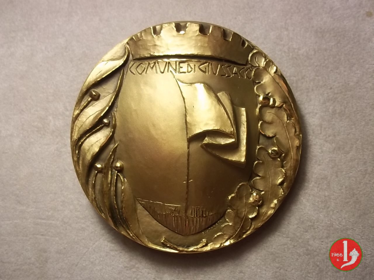 Comune di Giussago Dritto: Stemma del COMUNE DI GIUSSAGO turrito tra foglie d'alloro e quercia in basso, a dx: S. JOHNSON Contadina in piedi, di fronte, con grande cappello di paglia, allegorica della città di Giussago, tra cinque bimbi che danzano | |