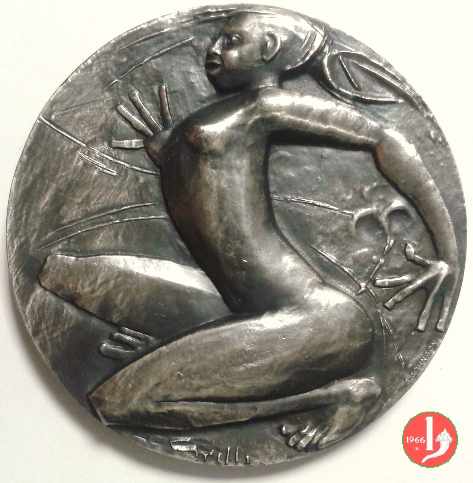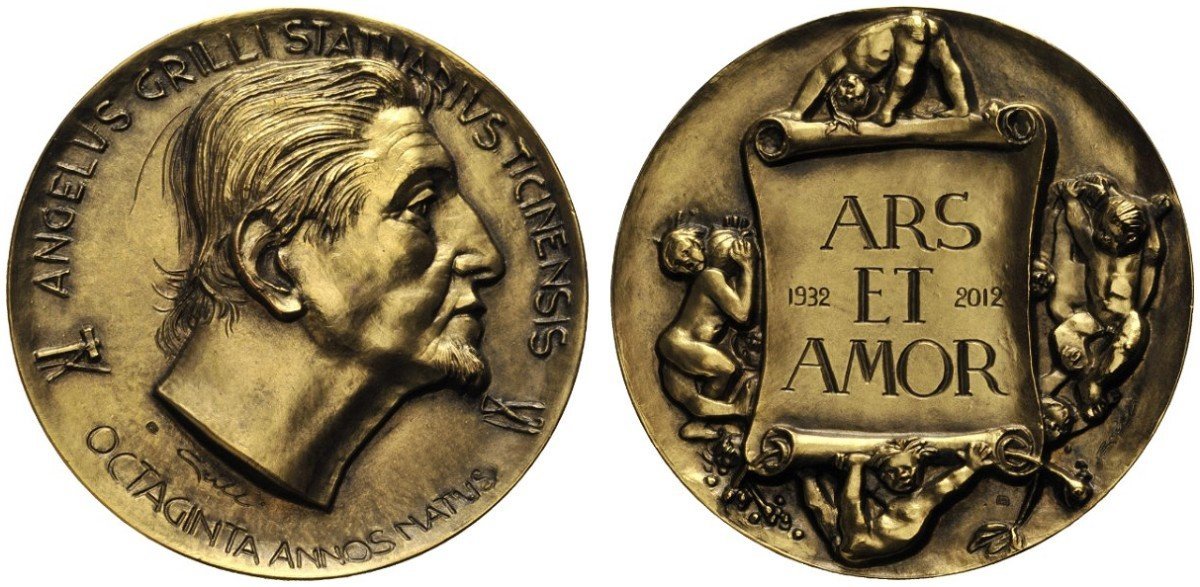 80° Angelo Grilli 2012 Dritto: ANGELUS GRILLI STATUARIUS TICINENSIS testa a dx tra martelli e scalpelli e compasso sotto: GRILLI in basso circolarmente: OCTAGINTA ANNOS NATUS e agli estremi del cartiglio: 1932 _ 2012 in basso a dx: GRILLI | |