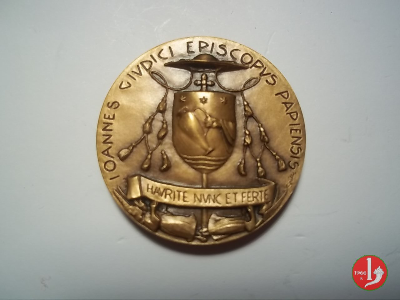 Giovanni Giudici Vescovo di Pavia Dritto: SUB TUUM PRAESIDIUM _ CONFUGIMUS busto della B. V. Maria di fronte regge bambino che reca globo crucigero in basso, a dx, entro il bordo interno: CIMAROSTI Stemma Vescovile sormontato da Croce e galero a sei nodi e su motto in nastro: AUTITE NUNC ET FERTE in basso: CDF | |