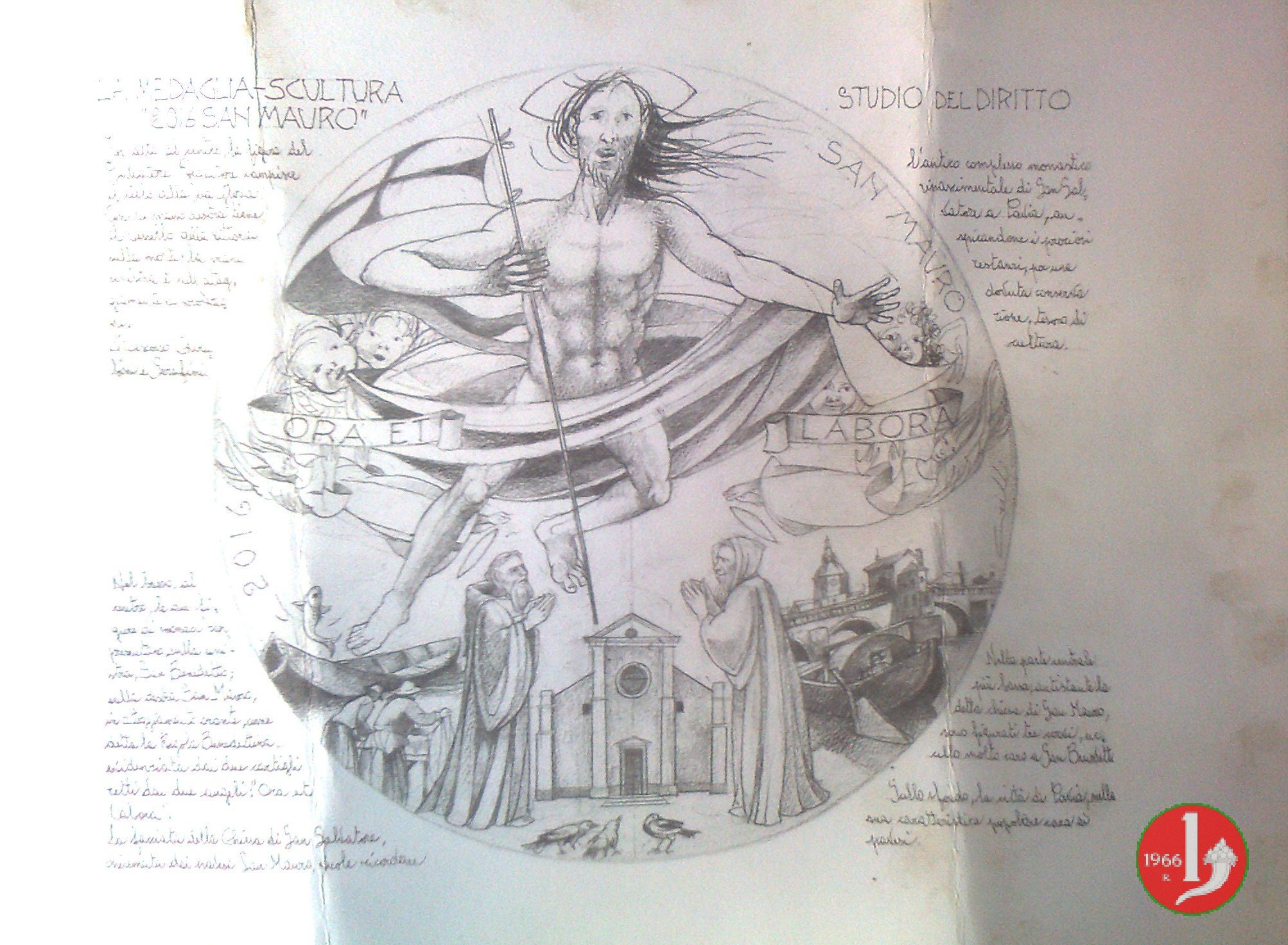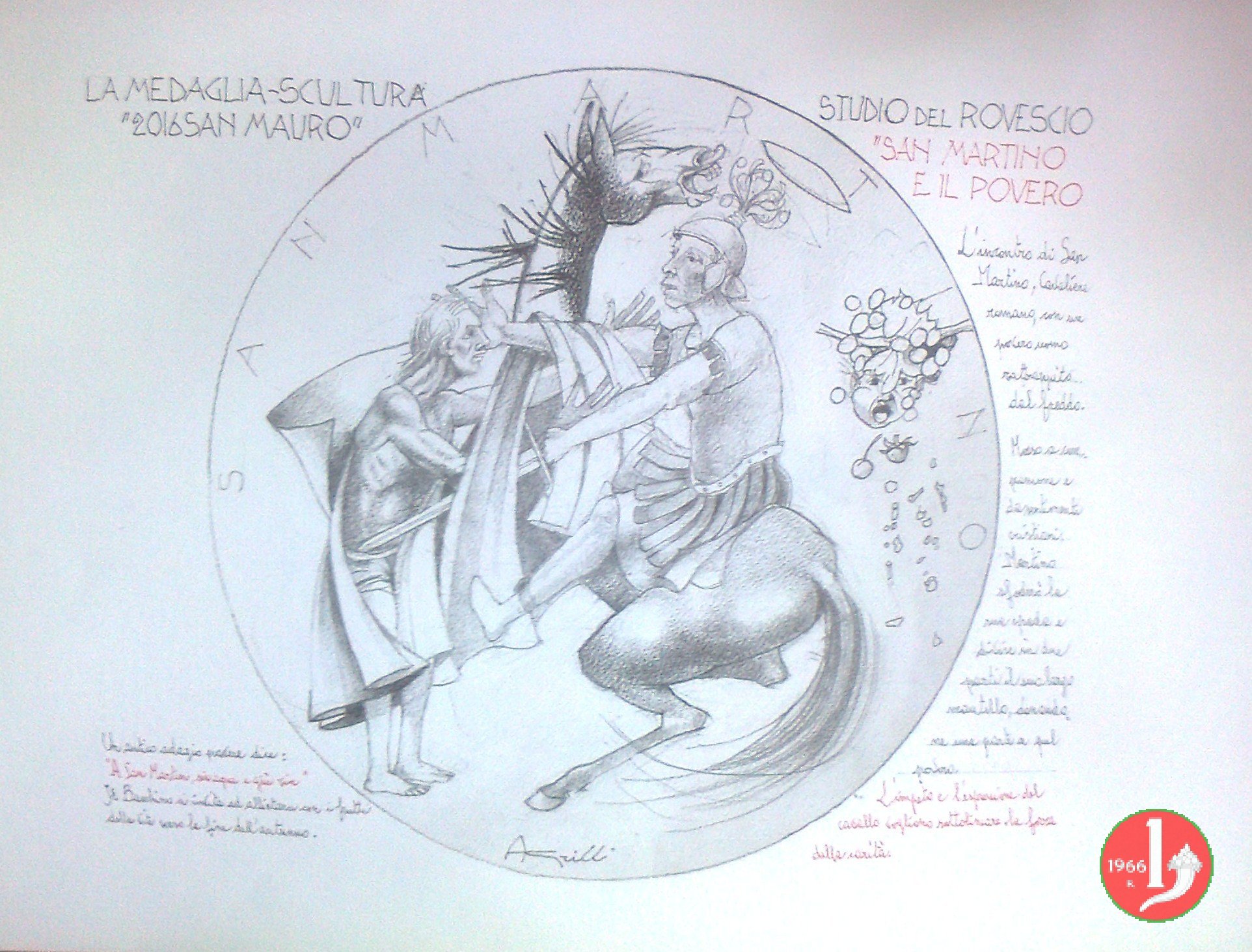 Chiesa SS Salvatore o di San Mauro (Bozzetto) Dritto: SAN MAURO _ 2016 Cristo Salvatore in gloria regge stendardo ai lati due Angeli con quattro bimbi reggono nastro con: ORA ET _ LABORA in basso: Prospetto anteriore della Chiesa del SS. Salvatore a Pavia tra due Santi oranti; a dx il Ponte coperto San Martino elmato e corazzato, a cavallo verso dx regge spada e taglia in due il suo mantello per donarne mezzo ad un mendicante in basso: AGRILLI | |
