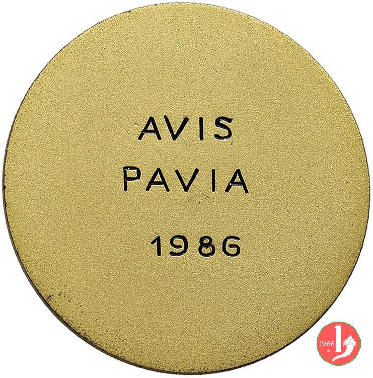 50° A.V.I.S. Pavia 1986 Dritto: Abbraccia di due uomini affrontati in piedi e legati da nastri legati al lati da in basso, a dx: GRILLI Sant'Agostino, Sant'Ambrogio e San Simpliciano sormontano le Le Tre Torri contornate da otto stelle e sullo sfondo la vista anteriore dell'Ospedale San Matteo in basso, a sx: LORIOLI | |