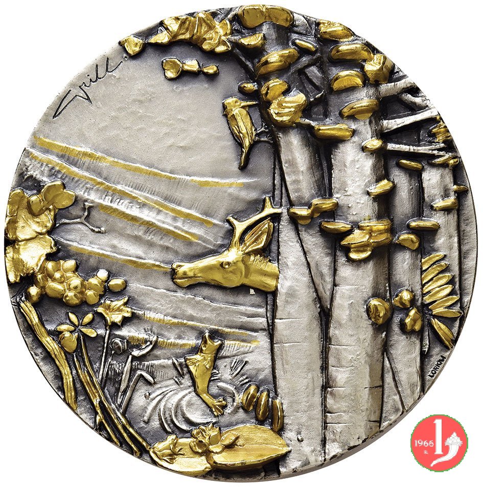 Provincia di Pavia per l'Ambiente 1986 Dritto: rappresentazione della natura e dei prodotti agricoli nella Provincia di Pavia: alberi, tralci di vite e mais in alto, a sx: GRILLI in basso a dx: LORIOLI Stemma coronato della Provincia di Pavia in basso: 1986 sotto: tralcio d'uva | |
