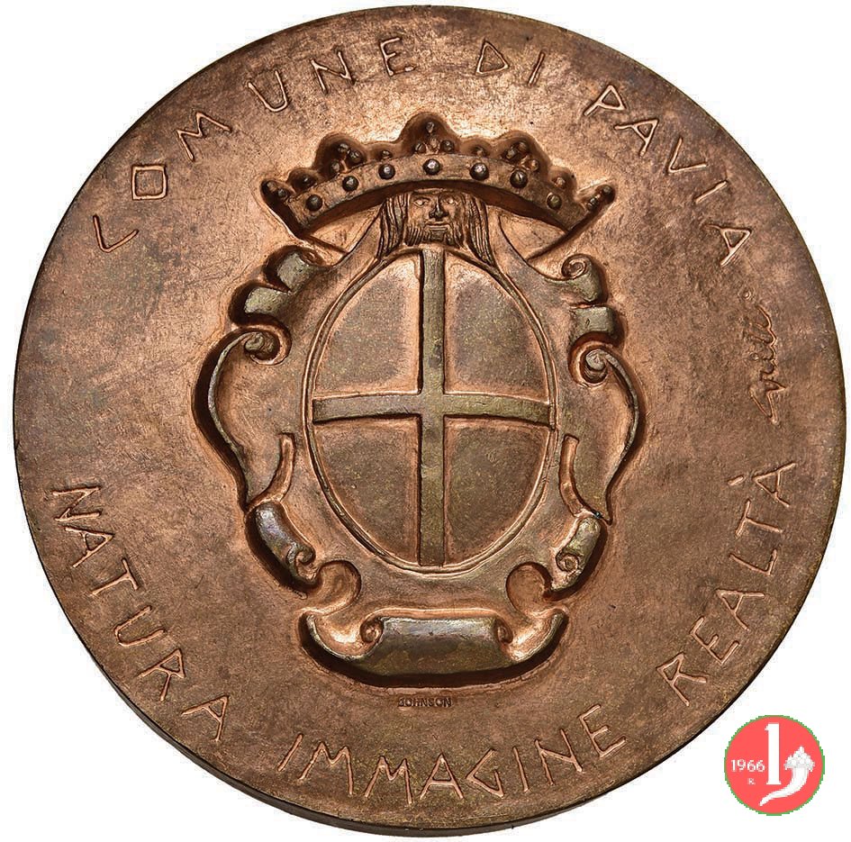Comune di Pavia - Natura Immagine Realta' Dritto: COMUNE DI PAVIA = NATURA IMMAGINE REALTA Stemma ovale e coronato del Comune di Pavia entro cartiglio sotto: S. JOHNSON a dx: GRILLI in basso: GRILLI | |