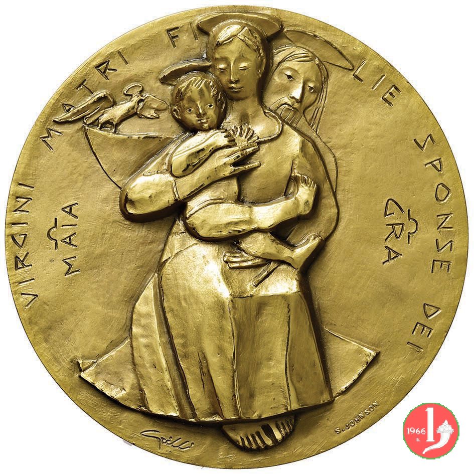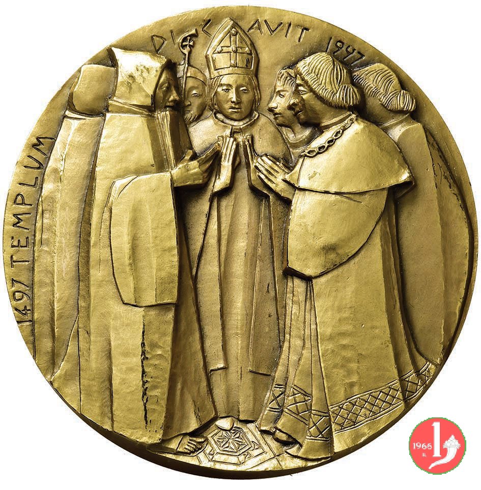 500° Dedicazione Certosa di Pavia 1997 Dritto: VIRGINI MATRI FI _ LIE SPONSE DEI la B. V. Maria nimbata e seduta di fronte, regge il Bambino, dietro lei San Giuseppe sporge a dx nimbato e a sx la Colomba dello Spirito Santo nimbata ai lati: MAIA _ GRA in basso: GRILLI _ S. JOHNSON il Nunzio Apostolico, Cardinale al titolo di Santa Croce e Vescovo di Sagunto, Bernardino Lopez de Carvajal con mitra di fronte tra Ludovico il Moro e Beatrice D'Este e i monaci | |