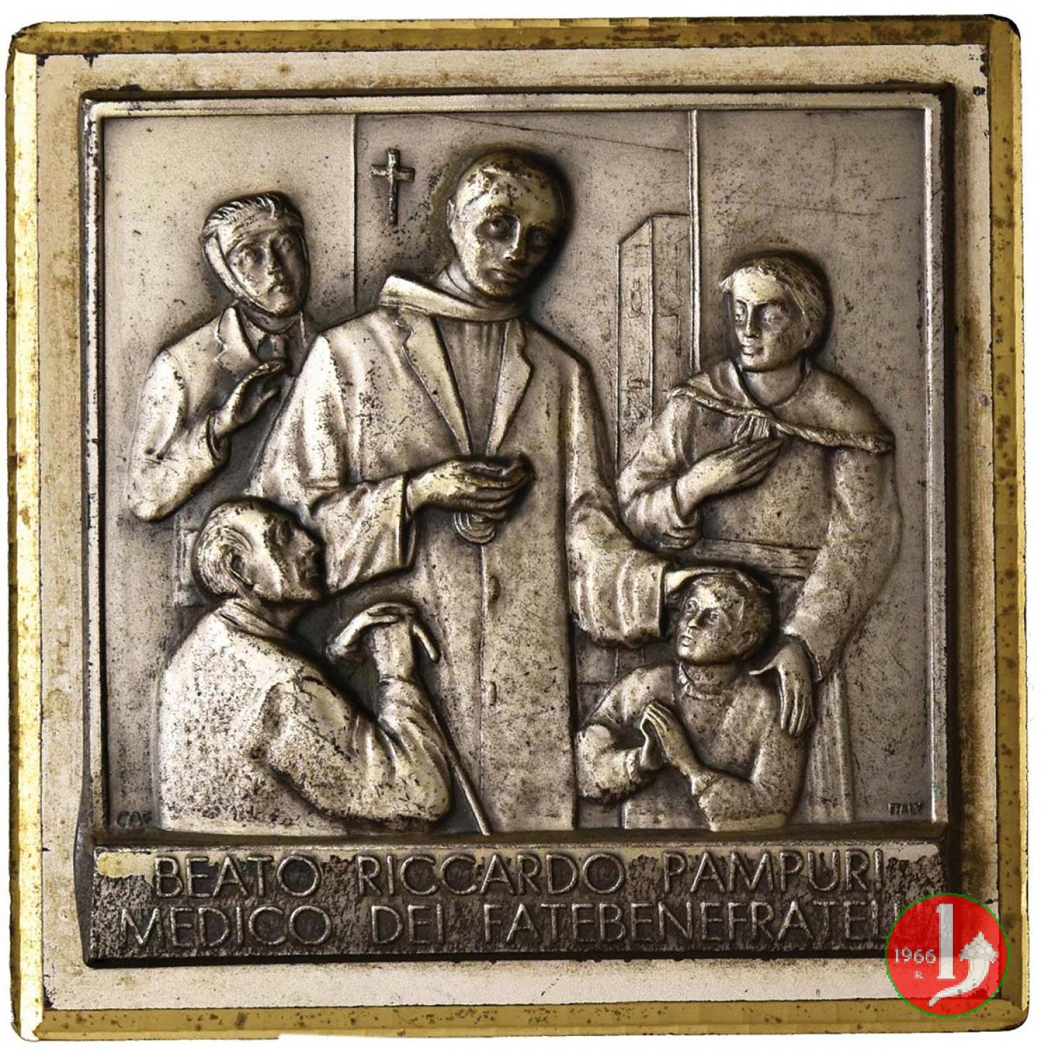 Riccardo Pampuri Dritto: busto di 3/4 a dx in piedi con cappotto e sciarpa tra un anziano genuflesso, due giovani e un ammalato in basso, ai lati: CDF _ ITALY in esergo: BEATO RICCARDO PAMPURI = MEDICO DEL FATEBENEFRATELLI | |