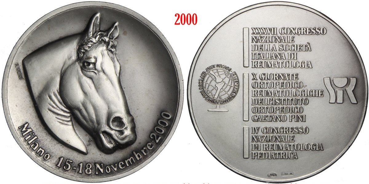 Reverse: nel campo tra logo JOINT MOTION e logo della Società Reumatologica, precedute da aste verticali: XXVII CONGRESSO = NAZIONALE = DELLA SOCIETA' = REUMATOLOGICA _ X GIORNATE = ORTOPEDICO- = REUMATOLOGICHE = DELL'ISTITUTO = ORTOPEDICO = GAETANO PINI _ IV CONGRESSO = NAZIONALE = DI REUMATOLOGIA = PEDIATRICA