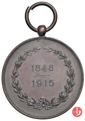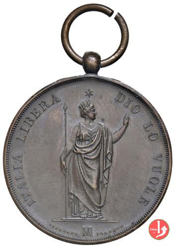 Obverse: riproduzione della Medaglia realizzata nel 1848 ed emessa per l'ingresso a Milano di Vittorio Emanuele II: la lotta, svoltasi nelle vie di Milano nel 1848, rappresentata da un cittadino in costume patriottico armato di fucile e pronto a far fuoco dietro una barricata mobile formata da fascine. Presso di lui un compagno in ginocchio e un ragazzo. In lontananza un drappello di artiglieri austriaci che si dispongono per l'attacco. Sulla base: 1848