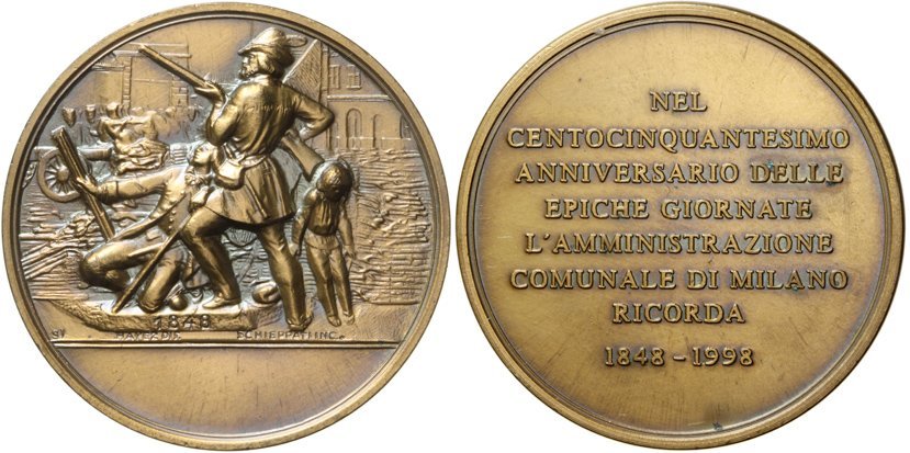 Reverse: nel campo: NEL = CENTOCINQUANTESIMO = ANNIVERSARIO DELLE = EPICHE GIORNATE = L'AMMINISTRAZIONE = COMUNALE DI MILANO = RICORDA = 1848-1998
