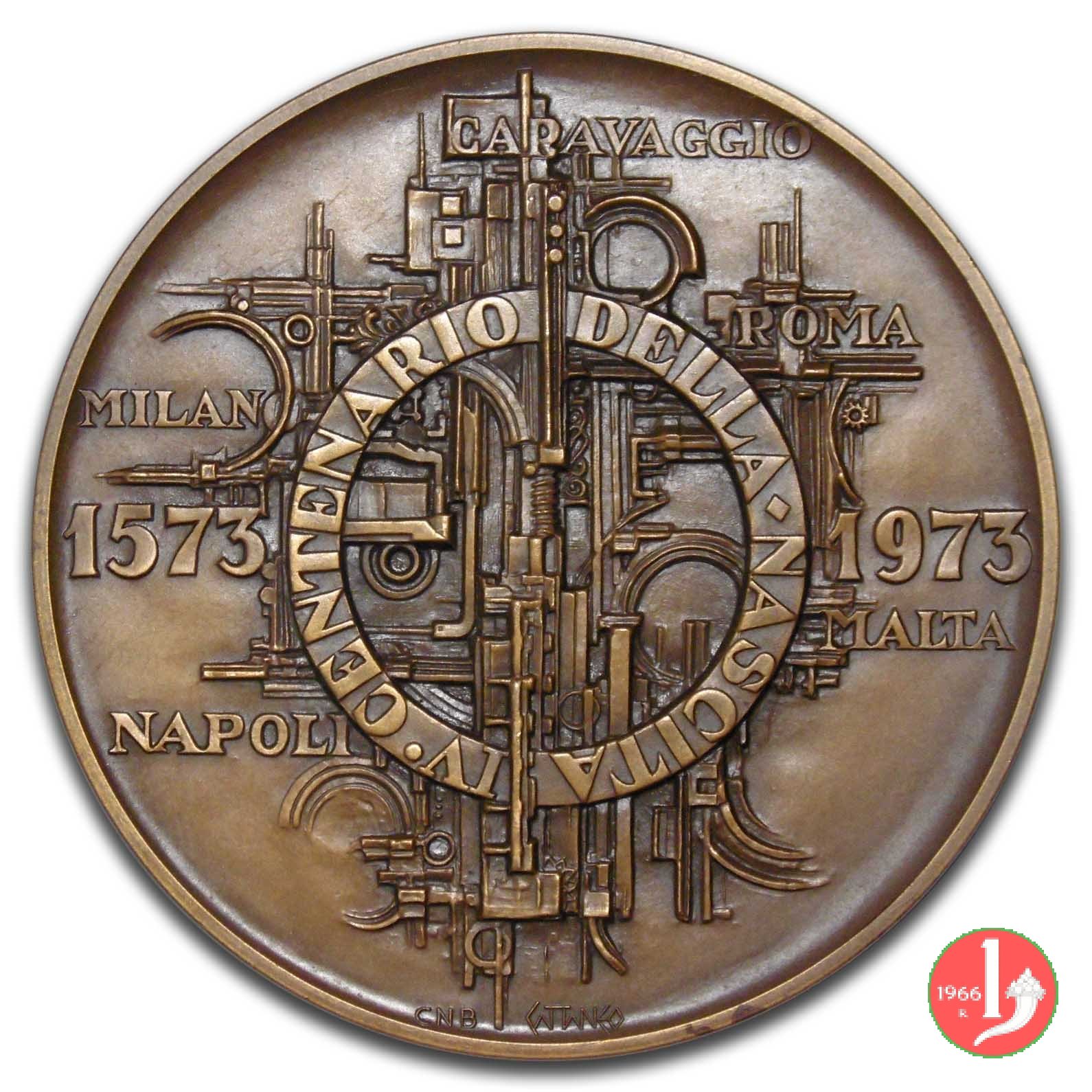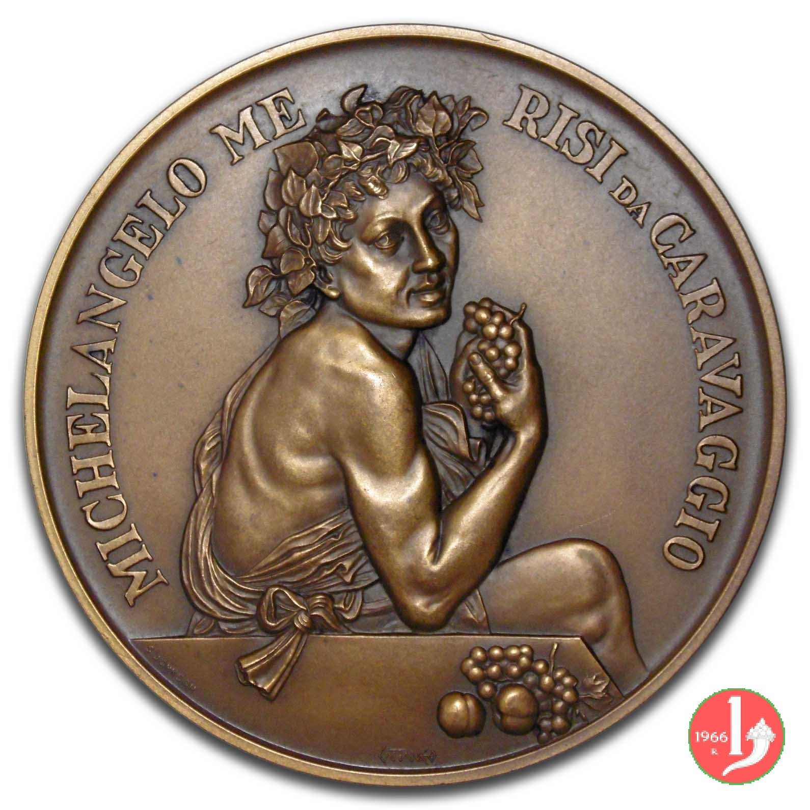 CN 400° Michelangelo Merisi-Bacco 1973 Dritto: MICHELANGELO ME _ RISI DA CARAVAGGIO Il Bacchino Malato del Caravaggio, saduto verso dx, con serto di frutta a frutta in mano (tratto dall'opera conservata nella Galleria Borghese a Roma) in basso: CATTANEO a sx presso il bordo: S. JOHNSON sul contorno di anello centrale: IV CENTENARIO DELLA NASCITA ai lati: 1573 _ 1973 CATTANEO | |