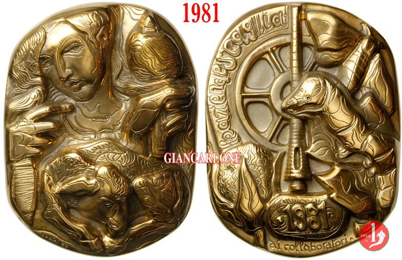 Aziende Scaglia 1981 Dritto: AZIENDE SCAGLIA puleggia lignea e fuso o spola per filati in verticale sotto: 1981 in esergo: AI COLLABORATORI | |