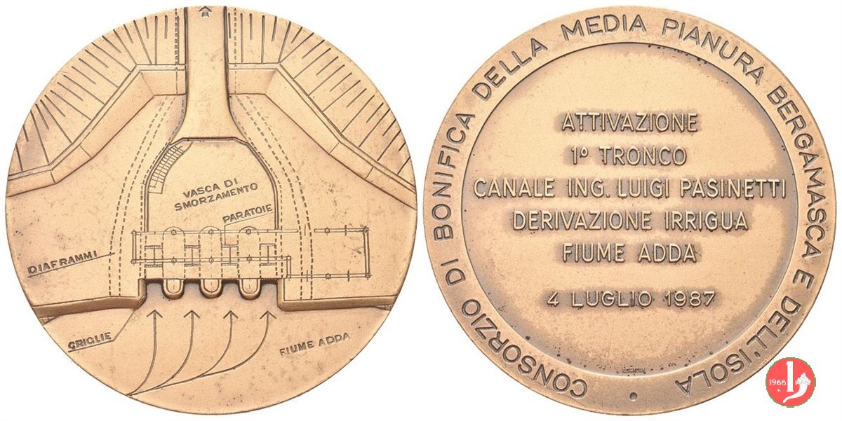 Deviazione dell'Adda 1987 Dritto: Planimetria con le indicazioni progettuali di massima della deviazione del FIUME ADDA: VASCA DI SMORZAMENTO _ PARATOIE _ DIAFRAMMI _ GRIGLIE Verso: CONSORZIO DI BONIFICA DELLA MEDIA PIANURA BERGAMASCA E DELL'ISOLA • (incuso) nel campo: ATTIVAZIONE = 1° TRONCO = CANALE ING. LUIGI PASINETTI = DERIVAZIONE IRRIGUA = FIUME ADDA = 4 LUGLIO 1987 in basso: LORIOLI | |