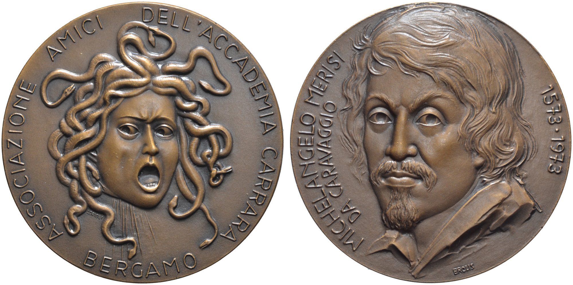 400° Michelangelo Merisi - Medusa 1973 Dritto: MICHELANGELO MERISI = DA CARAVAGGIO _ 1573-1973 busto di 3/4 a sx di Caravaggio in basso: BROLIS Testa di Medusa (dall'opera conservata agli Uffizi) nel campo in piccolo: LORIOLI | |