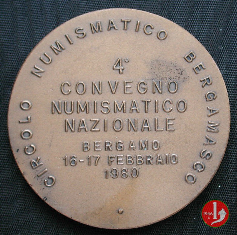 CN 4° Convegno Numismatico Bergamo 1980 Dritto: Vista del centro storico di Bergamo con la Piazza Vecchia, Palazzo della Ragione e la Torre del Campanone presso il bordo, a dx: NANI nel campo: 4° = CONVEGNO = NUMISMATICO = NAZIONALE = BERGAMO = 16-17 FEBBRAIO = 1980 in basso: LORIOLI | |