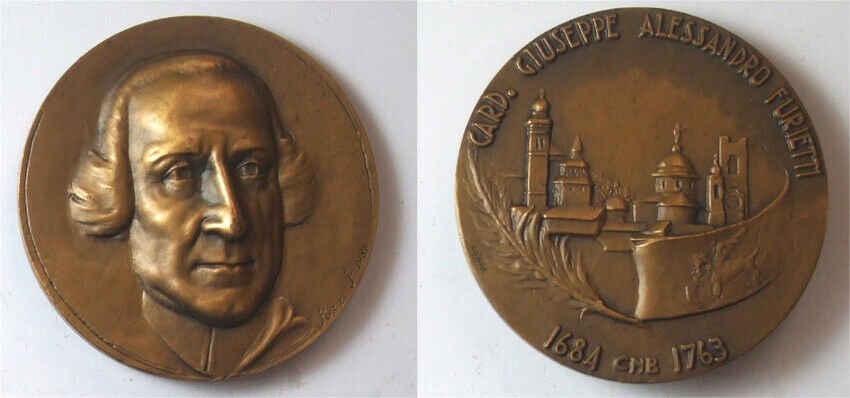 300° Giuseppe Alessandro Furietti 1984 Dritto: busto di fronte del Card. Furietti in basso a dx: POZZI F. 1984 vista dei monumenti della Città Alta con alla base penna d'oca e gonfalone con leone di San Marco sotto: 1684 -1763 in basso a sx: LORIOLI | |