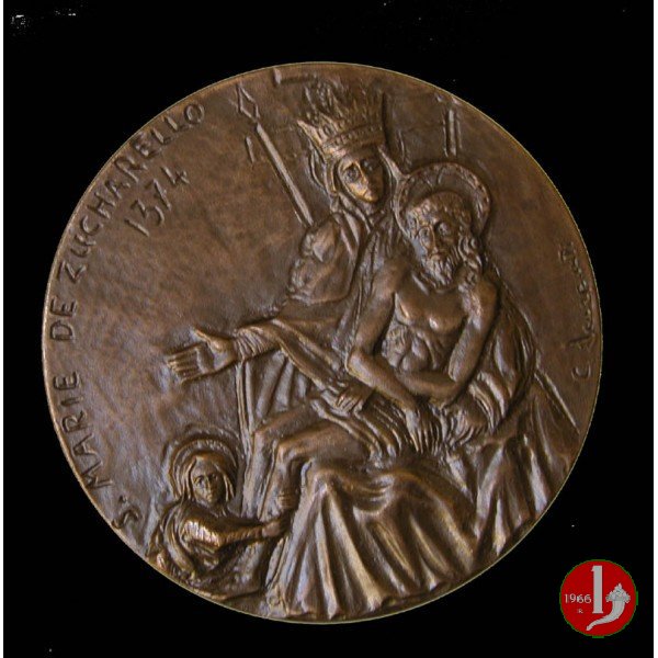 Nembro - Madonna dello Zuccarello 1987 Dritto: S. MARIE DE ZUCHARELLO = 1374 La B. V. seduta e coronata con Cristo morente, nimbato, in braccio a dx, presso il bordo, corsivo: Scarpanti nel campo, entro rami d'alloro fermati in basso da Stemma del Comune: MOSTRA = NUMISMATICA = 28 • 29 NOV. 87 | |