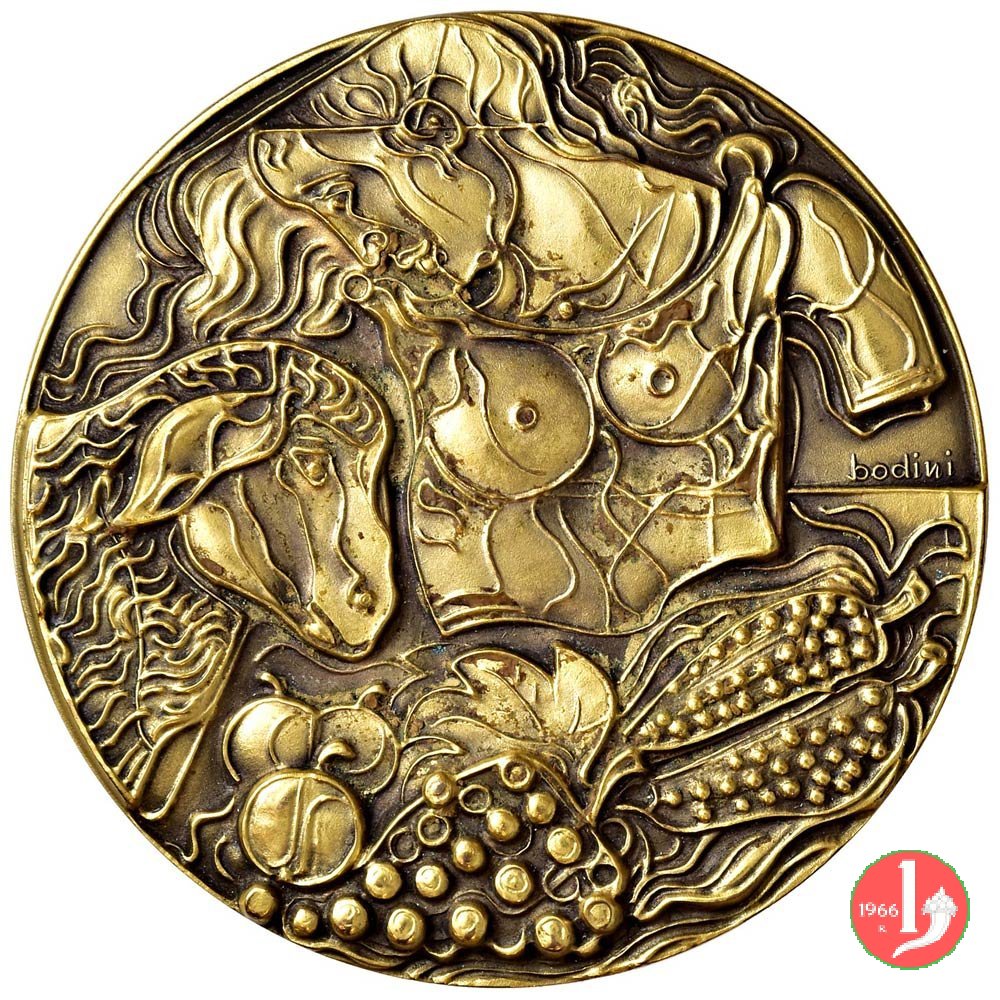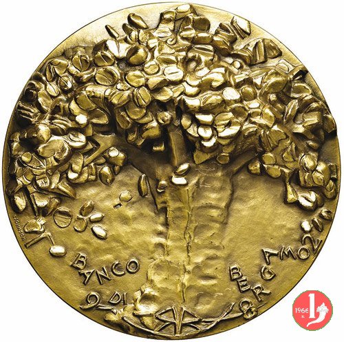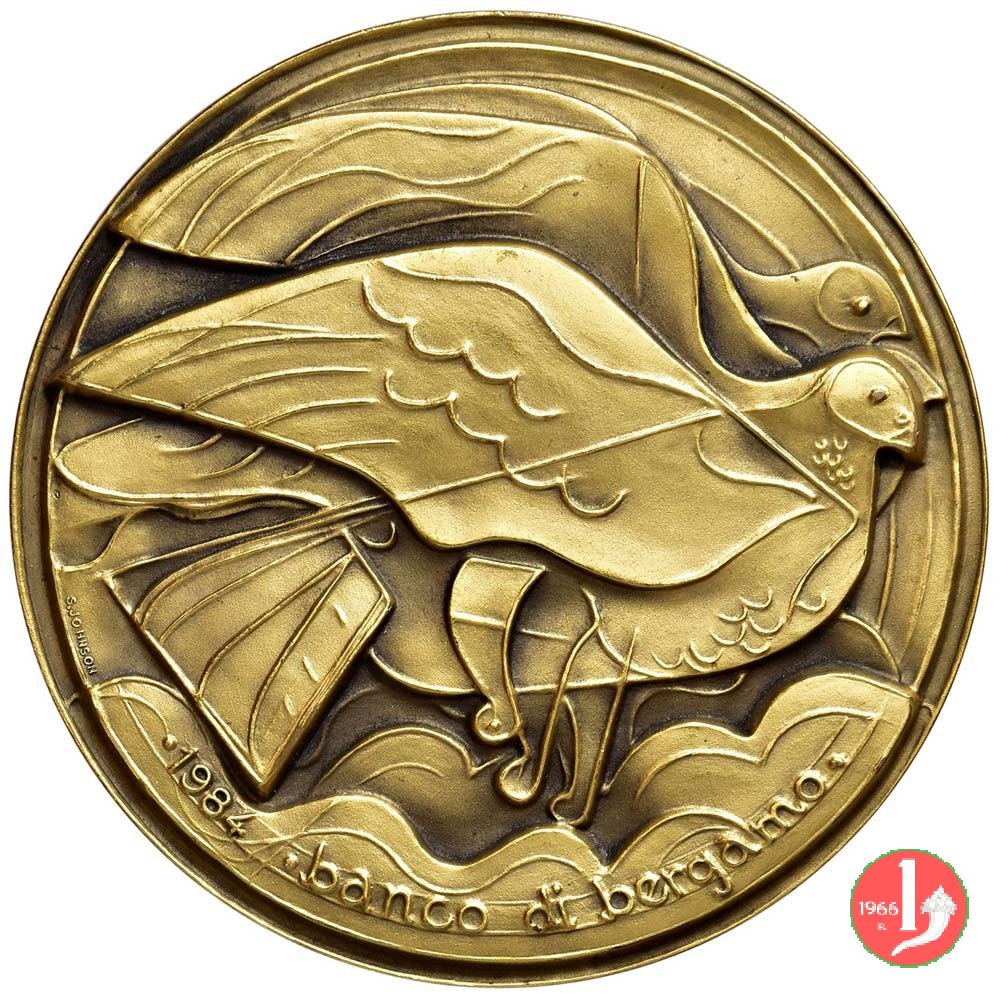 Banco di Bergamo 1984 Dritto: busto femminile nudo con testa di pecora e frutti nel campo a dx: BODINI in basso: • 1984 • BANCO DI BERGAMO • in basso, a sx: S. JOHNSON | |