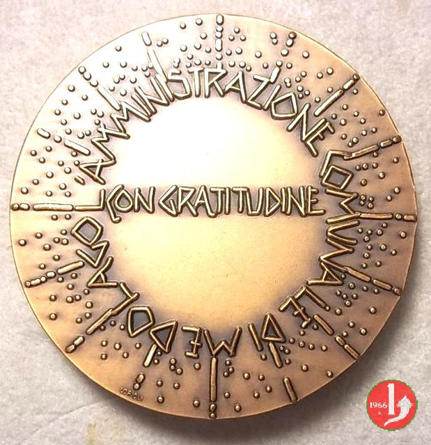 Comune di Bergamo 1972 Dritto: C.N.B. _ 1972 alcuni monumenti di Bergamo formano una stella a 8 raggi in campo stellato al centro della Piazza, circolarmente: BERGAMO spazio per dedica (2008) in basso: OMEA - MI | |