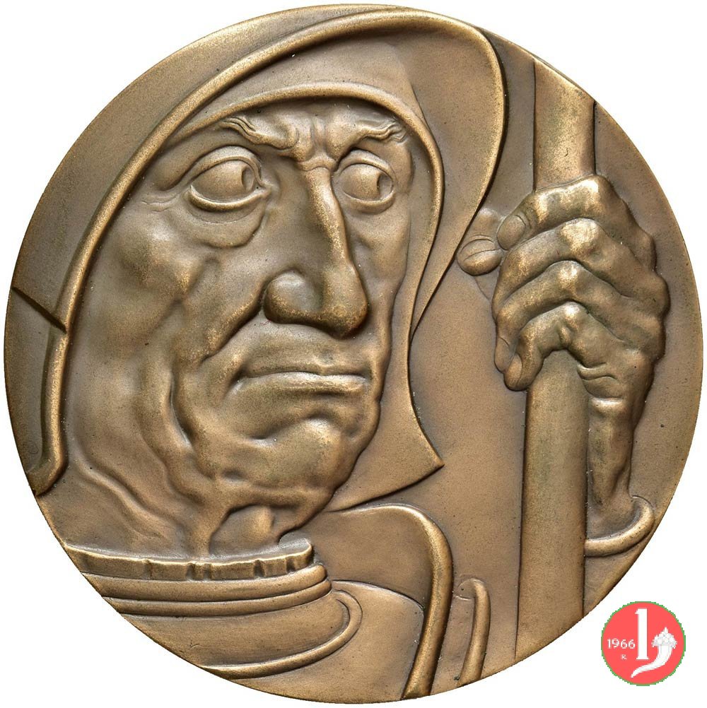 Centro Culturale S. Bartolomeo 1980 Dritto: S. ALBERTO MAGNO _ S. CATERINA DA SIENA = VII CENT. DELLA M. 1280-1980 _ 1380-1980 VI CENT. DELLA M. i due Santi in piedi di fronte con mantelli e separati da ramo d'albero fogliato in basso: STEFANO _ LOCATELLI nel campo, in alto, tra tavolozza con pennelli e scalpelli e martello: X sotto: 1970 1980 = compasso con squadra, libro aperto e rigo con note musicali in basso: BERGAMO = stemma = LORIOLI | |