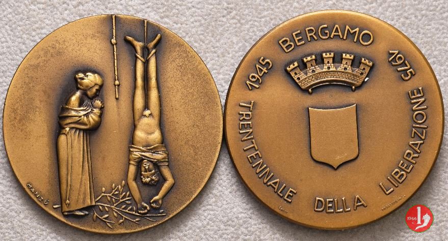 30° della Liberazione 1975 Dritto: figura femminile in piedi orante presso giovane appeso per i piedi su ramo d'ulivo in basso a sx: MANZU' Stemma vuoto turrito | |