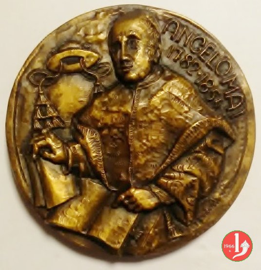 CN Angelo Maj 1979 Dritto: ANGELVS - MAIVS - 1782 - 1854 busto di 3/4 a sx con mozzetta presso libreria con stemma in alto in basso, a sx: A NANI = FECIT in campo diviso verticalmente: Vista di Bergamo e di Schilpario BG (paese natale) | |