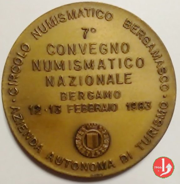 CN 7° Convegno Numismatico Nazionale 1983 Dritto: riproduzione del Grosso da sei denari di Federico II per Bergamo: facciata di chiesa fiancheggiata da quattro torri su archi e rocce ai lati verticalmente: PGA _ MVM nel campo: 7° = CONVEGNO = NUMISMATICO = NAZIONALE = BERGAMO = 12 • 13 FEBBRAIO 1983 = logo in basso: LORIOLI | |