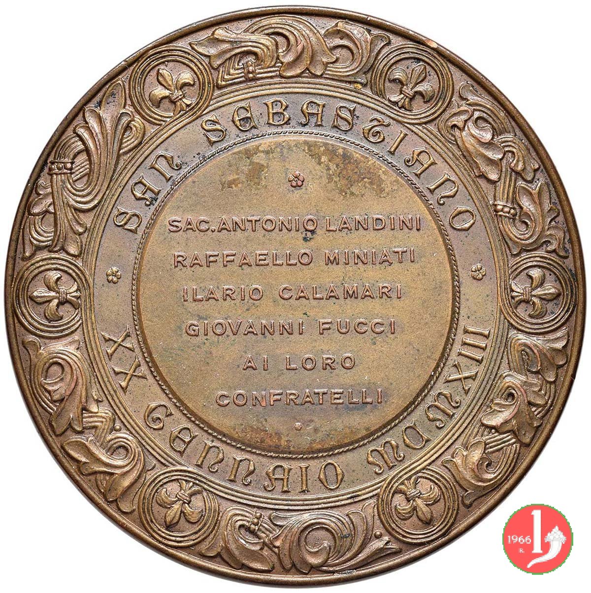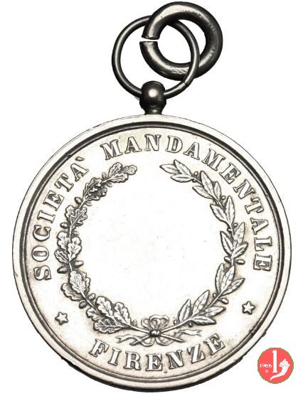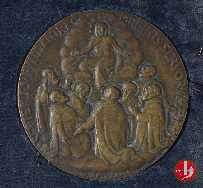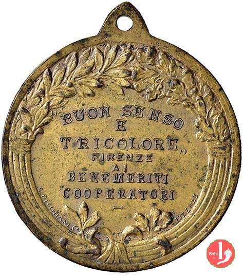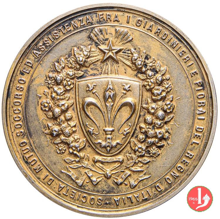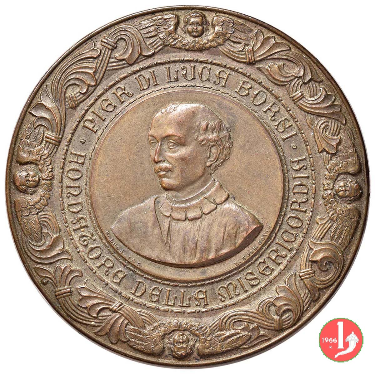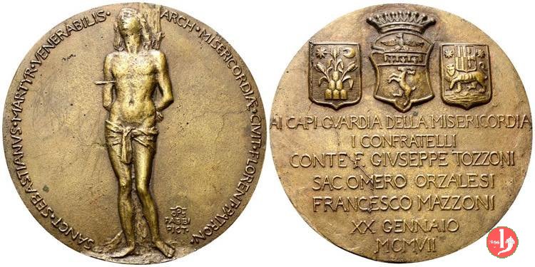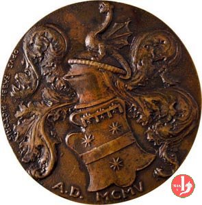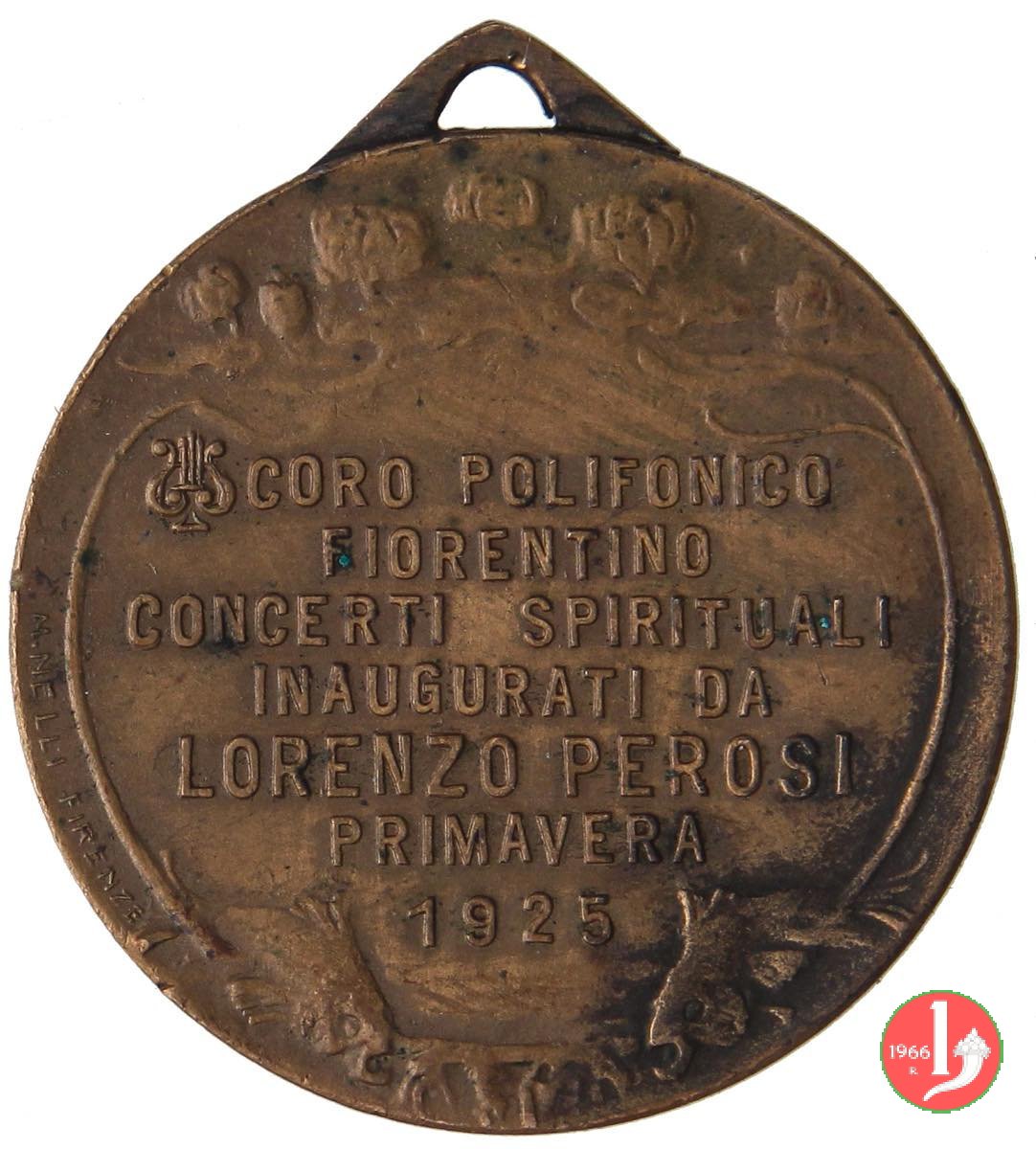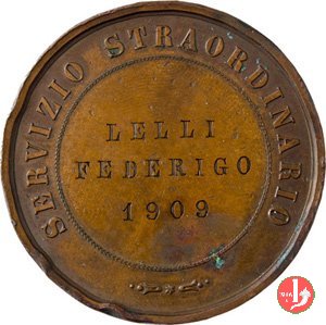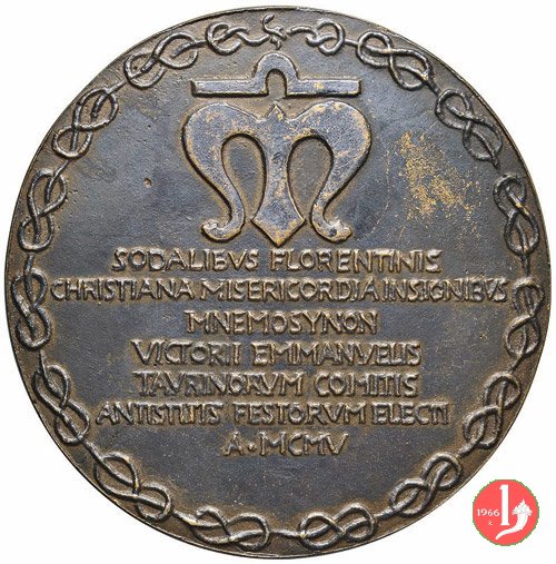 Verso: entro contorno di nodi d'amore generati da corda spezzata in alto: logo della Confraternita della Misericordia di Firenze (M gotica sormontata da omega) = SODALIBVS FLORENTINIS = CHRISTIANA MISERICORDIA INSIGNIBVS = MNEMOSYNON = VICTORII EMMANVELIS = TAVRINORVM COMITIS = ANTISTITIS FESTORVM ELECTIS = A • MCMV