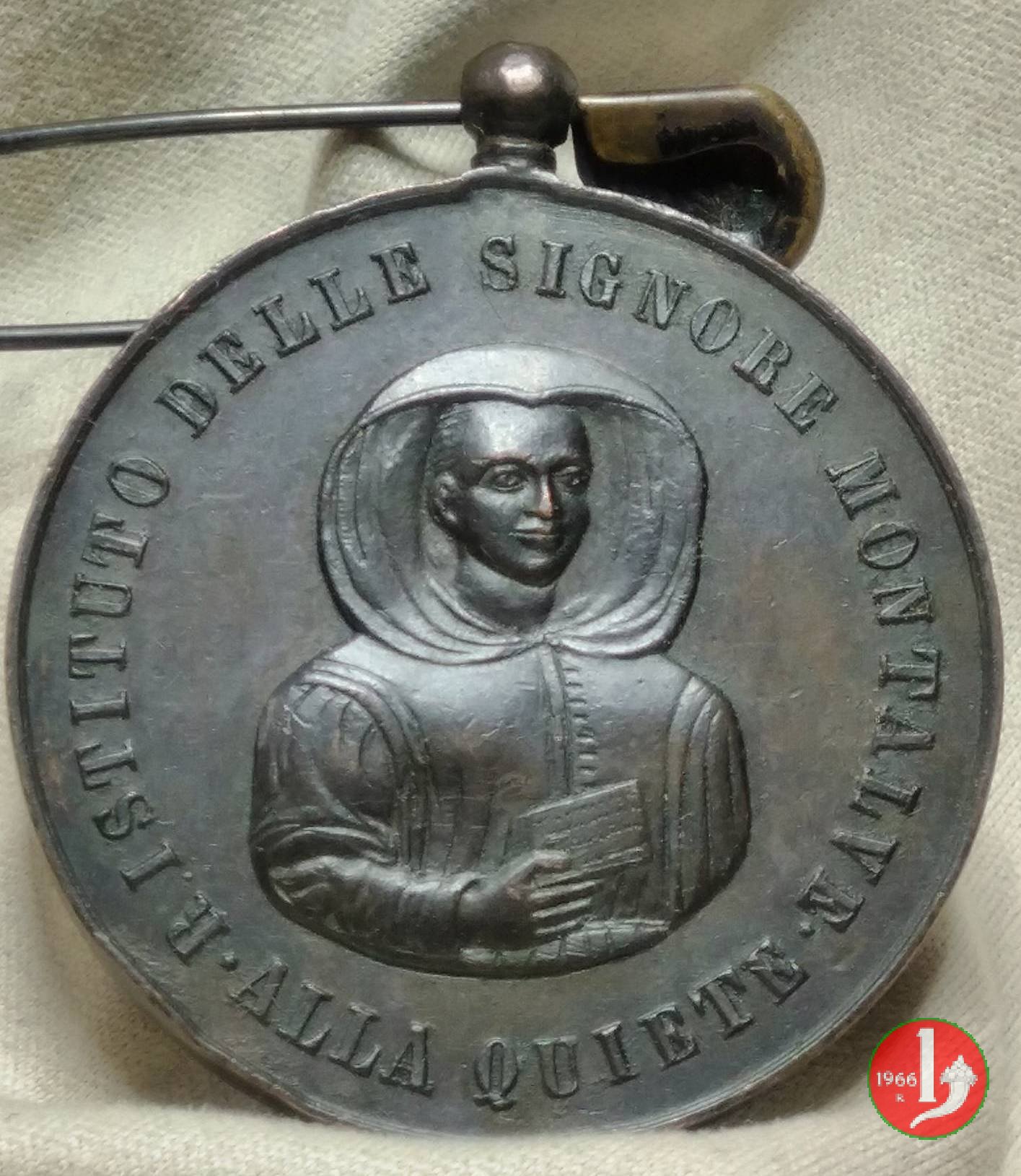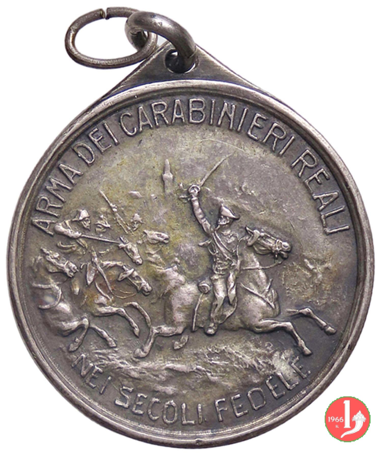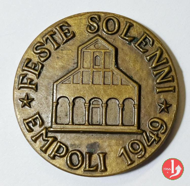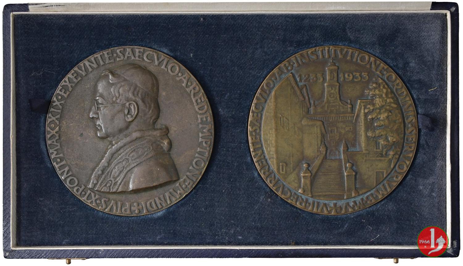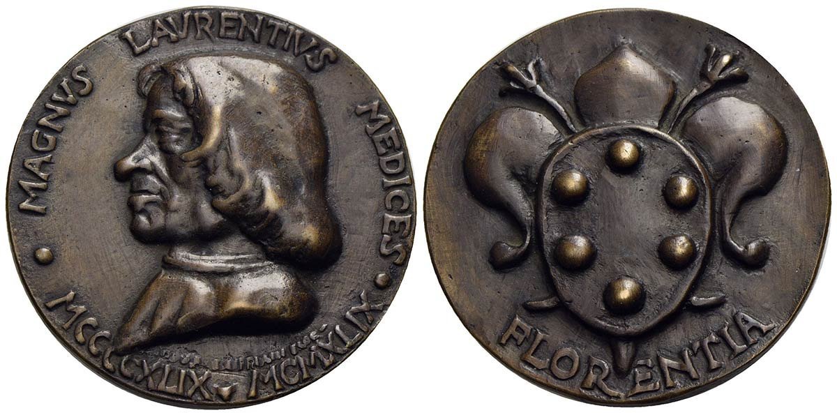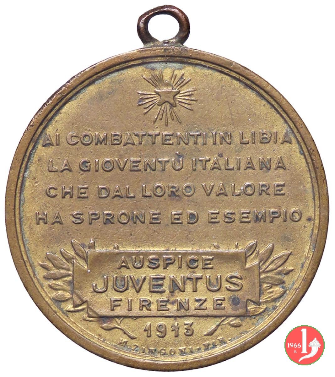 Verso: entro contorno di nodi d'amore generati da corda spezzata in alto: logo della Confraternita della Misericordia di Firenze (M gotica sormontata da omega) = SODALIBVS FLORENTINIS = CHRISTIANA MISERICORDIA INSIGNIBVS = MNEMOSYNON = VICTORII EMMANVELIS = TAVRINORVM COMITIS = ANTISTITIS FESTORVM ELECTIS = A • MCMV