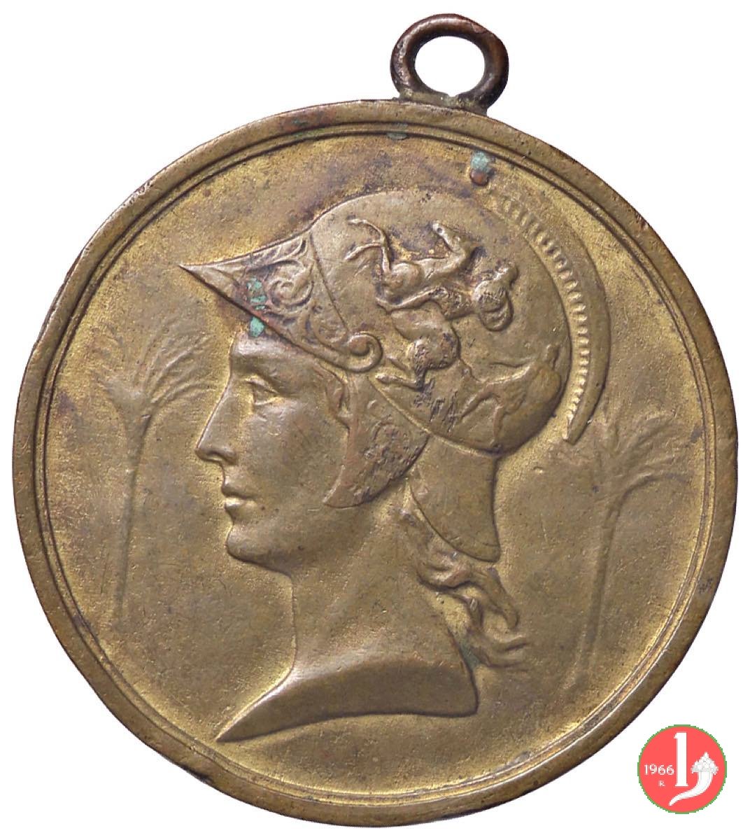 Dritto: busto di figura femminile di fronte con elmo alato e collana a tre fili di perle su rami d'alloro e palma tra nastri e fermati al centro da triangolo, martello e fascina